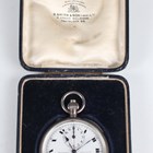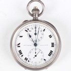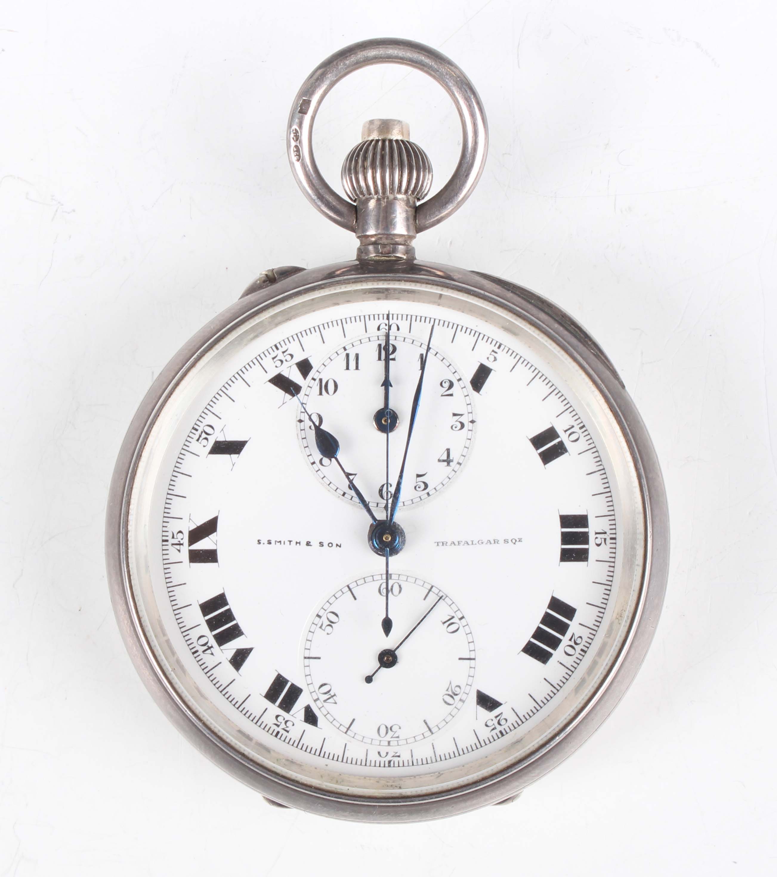 An early 20th century silver cased keyless wind open-faced gentleman's chronograph pocket watch, the jewelled movement detailed 'Contetout' and numbered '71222', the white enamelled dial with black Roman hour numerals, two subsidiary dials and centre stop seconds and detailed 'S. Smith & Son Trafalgar SqE', import mark London 1917, total weight 93g, case diameter 5cm, with original blue leather case.