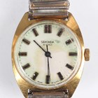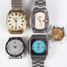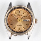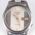 A Seiko 5 Automatic stainless steel gentleman's bracelet wristwatch, Ref. 7009-3100, the tapered link bracelet with signed foldover clasp, case width 3.5cm, together with a Seiko 5 Automatic steel cased gentleman's wristwatch, Ref. 6349-5030, case width 3.5cm, a Seiko 5 Automatic lady's wristwatch, a Sekonda gentleman's wristwatch and a Cardinal wristwatch, case diameter 3.2cm.