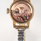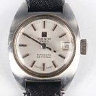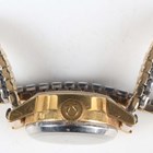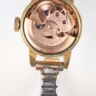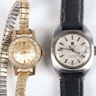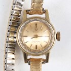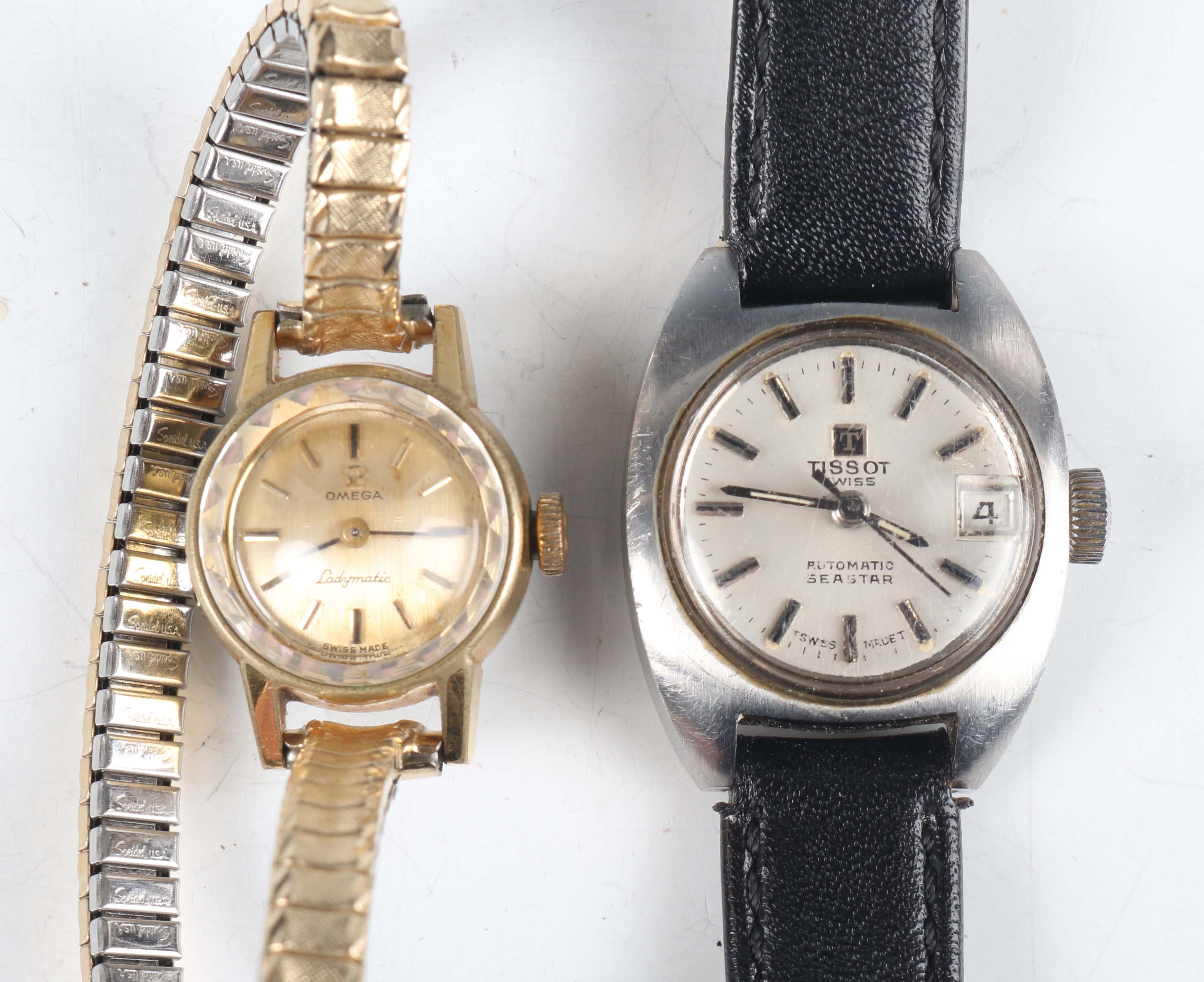 An Omega Ladymatic gilt metal fronted and steel backed lady's wristwatch, case diameter 1.7cm, on a gilt metal expanding bracelet, together with a Tissot Seastar Automatic steel cased lady's wristwatch, case width 2.2cm, on a black leather strap.