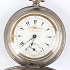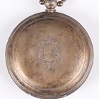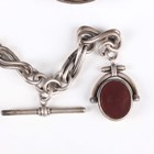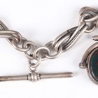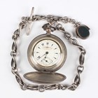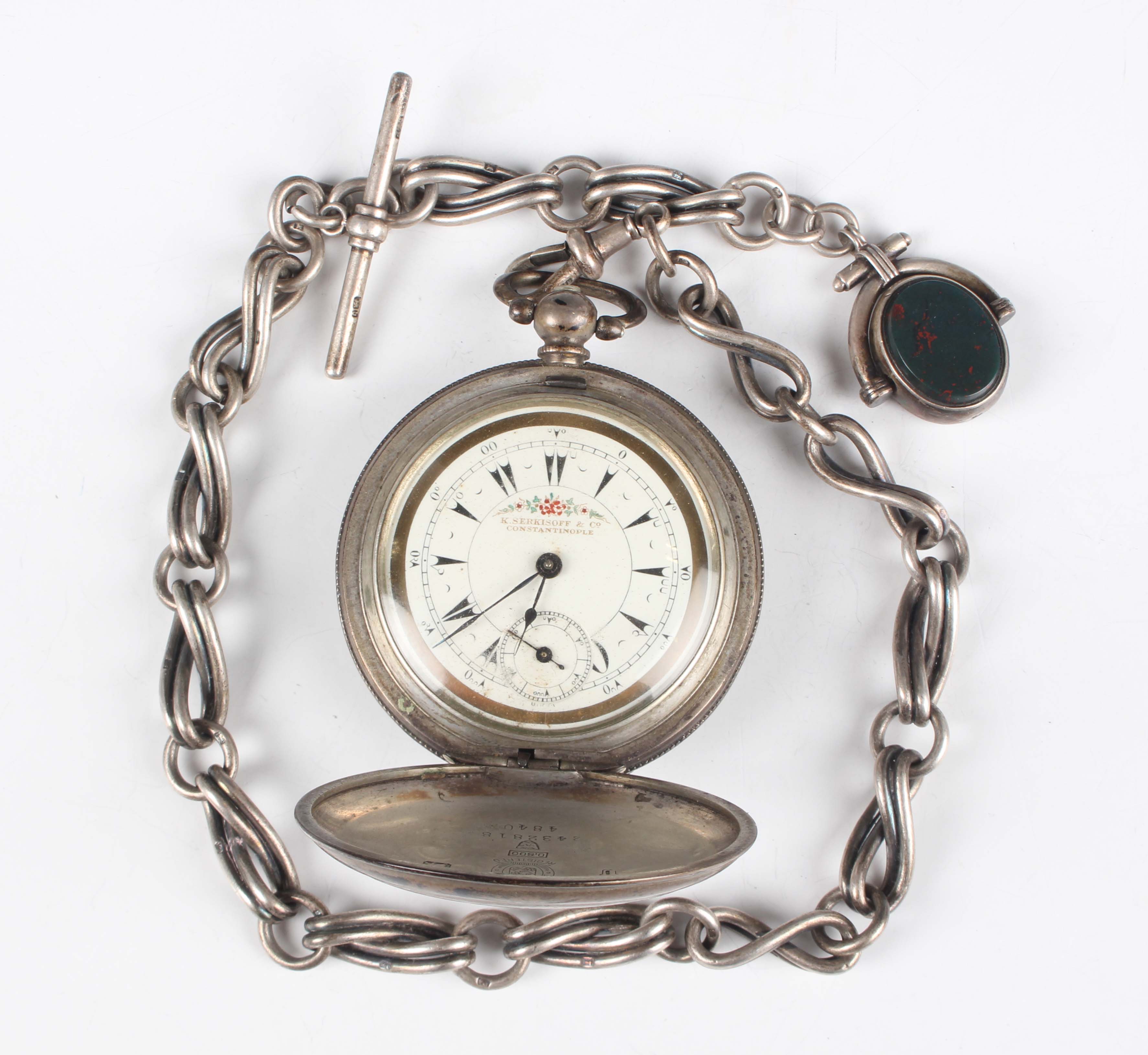 A Turkish market 0.800 silver hunting cased keywind gentleman's pocket watch, the jewelled movement detailed 'Billodes', the white enamelled dial with black Turkish hour markers and subsidiary seconds and detailed 'K. Serkisoff & Co Constantinople', the outer case with engine turned decoration, case diameter 5.1cm, with a silver Albert chain, fitted with T-bar, swivel and rotating fob seal, weight 63.4g, length 41cm.