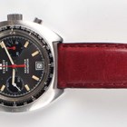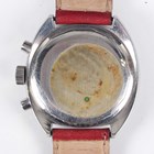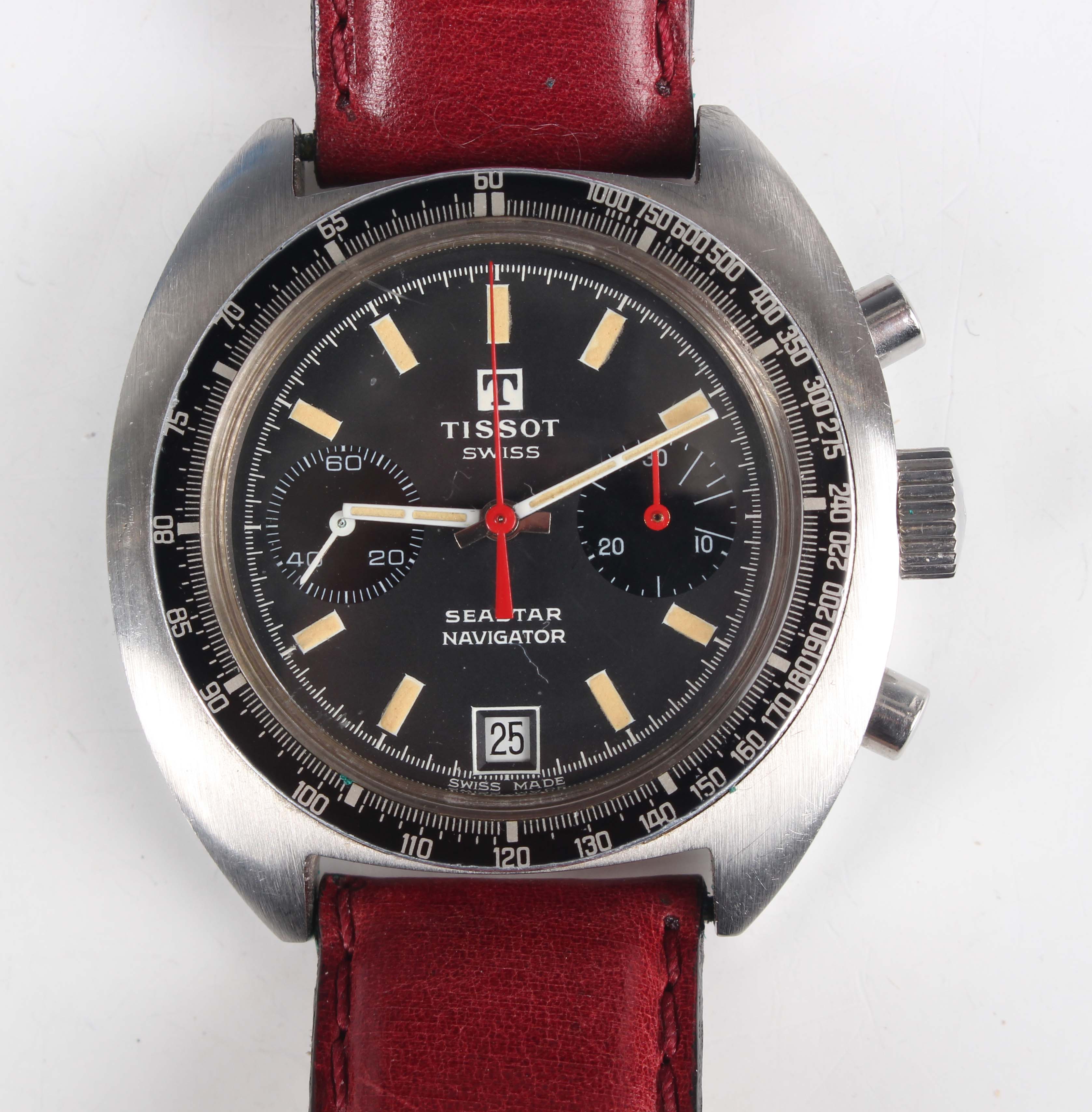 A Tissot Seastar Navigator stainless steel cased gentleman's chronograph wristwatch, circa 1970s, with jewelled manual wind movement, the signed black dial with luminous baton hour markers, two subsidiary dials and date aperture at 6 o'clock, the tonneau shaped case with black tachymeter scale bezel, case width 4cm, on a leather strap.