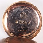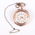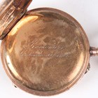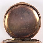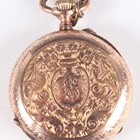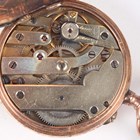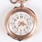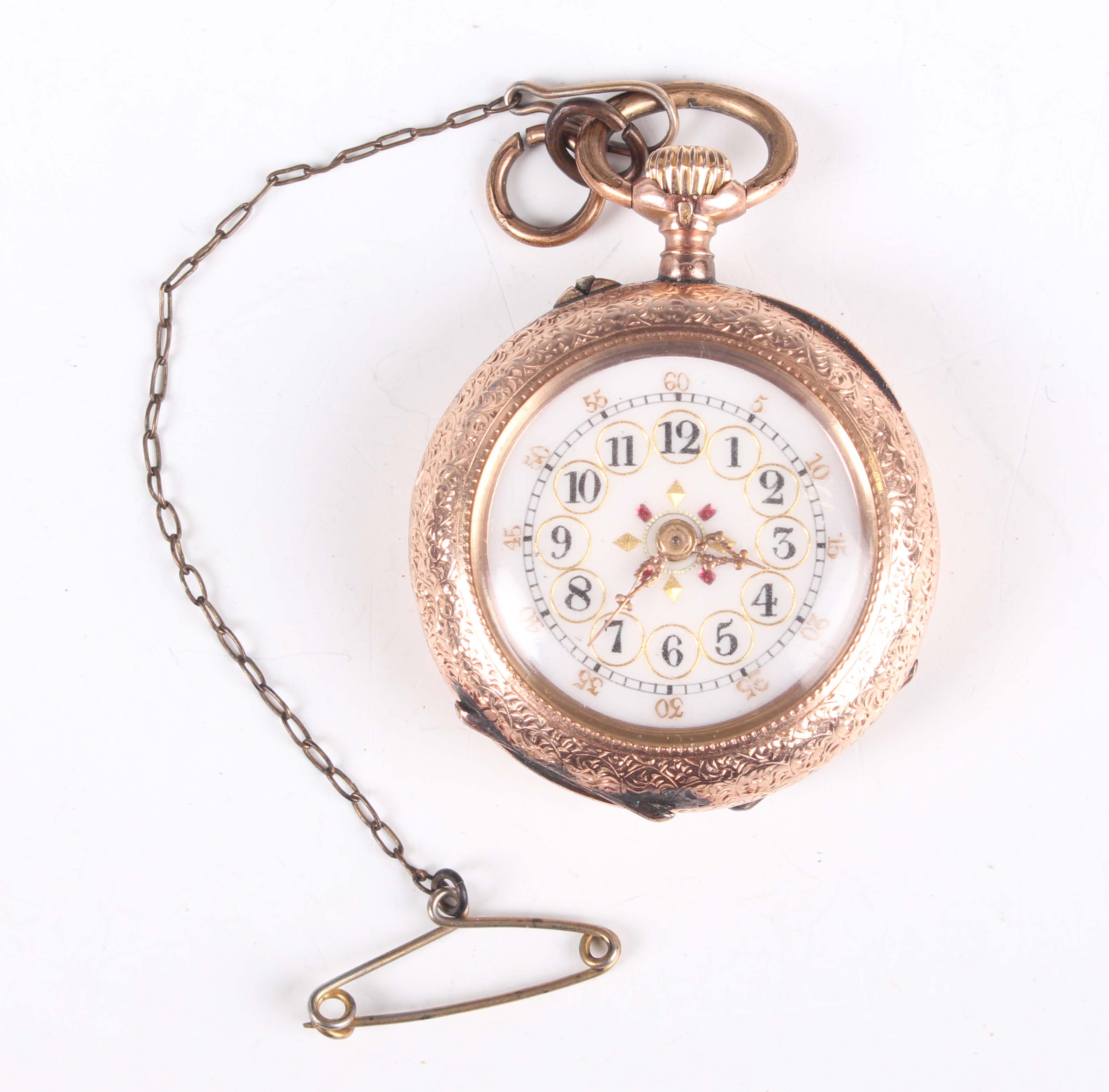 A 14K gold cased keyless wind open-faced lady's fob watch, the enamelled dial with black Arabic hour numerals within red and gilt decorated borders, with gilt metal inner case, the case exterior with foliate engraved decoration, total weight 22.4g, case diameter 2.9cm.