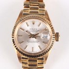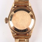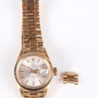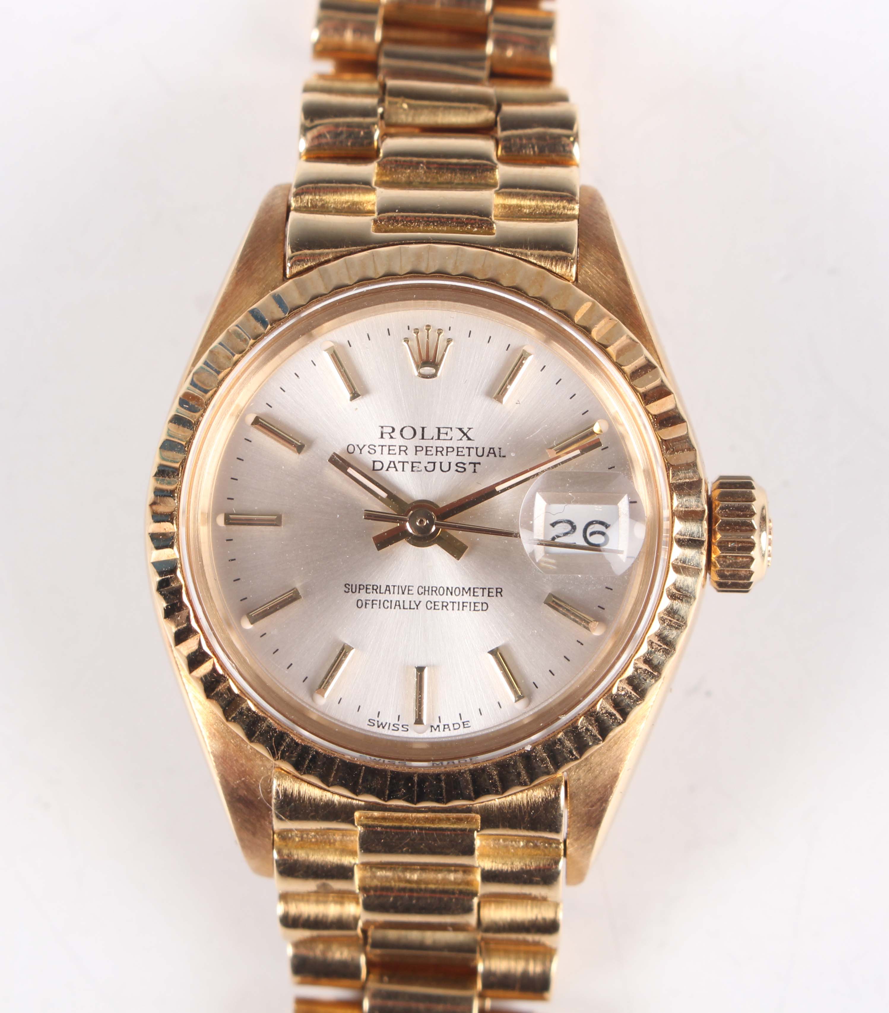 A Rolex Oyster Perpetual Datejust 18K gold lady's bracelet wristwatch, Ref. 6917, circa 1975, the signed and jewelled 2030 caliber movement numbered '85548', the signed silvered dial with gilt Rolex crown at 12 o'clock, gilt baton hour markers and date aperture, the case with fluted bezel, numbered between the lugs '6917' and '4090997', Rolex crown to winding button, the signed case back interior detailed '18K 750' and numbered '6917', the tapered link bracelet with signed foldover clasp, detailed '750', total weight 63.2g, case diameter 2.5cm, with spare link.