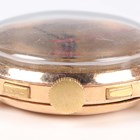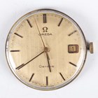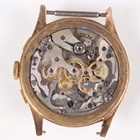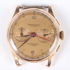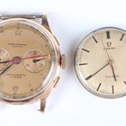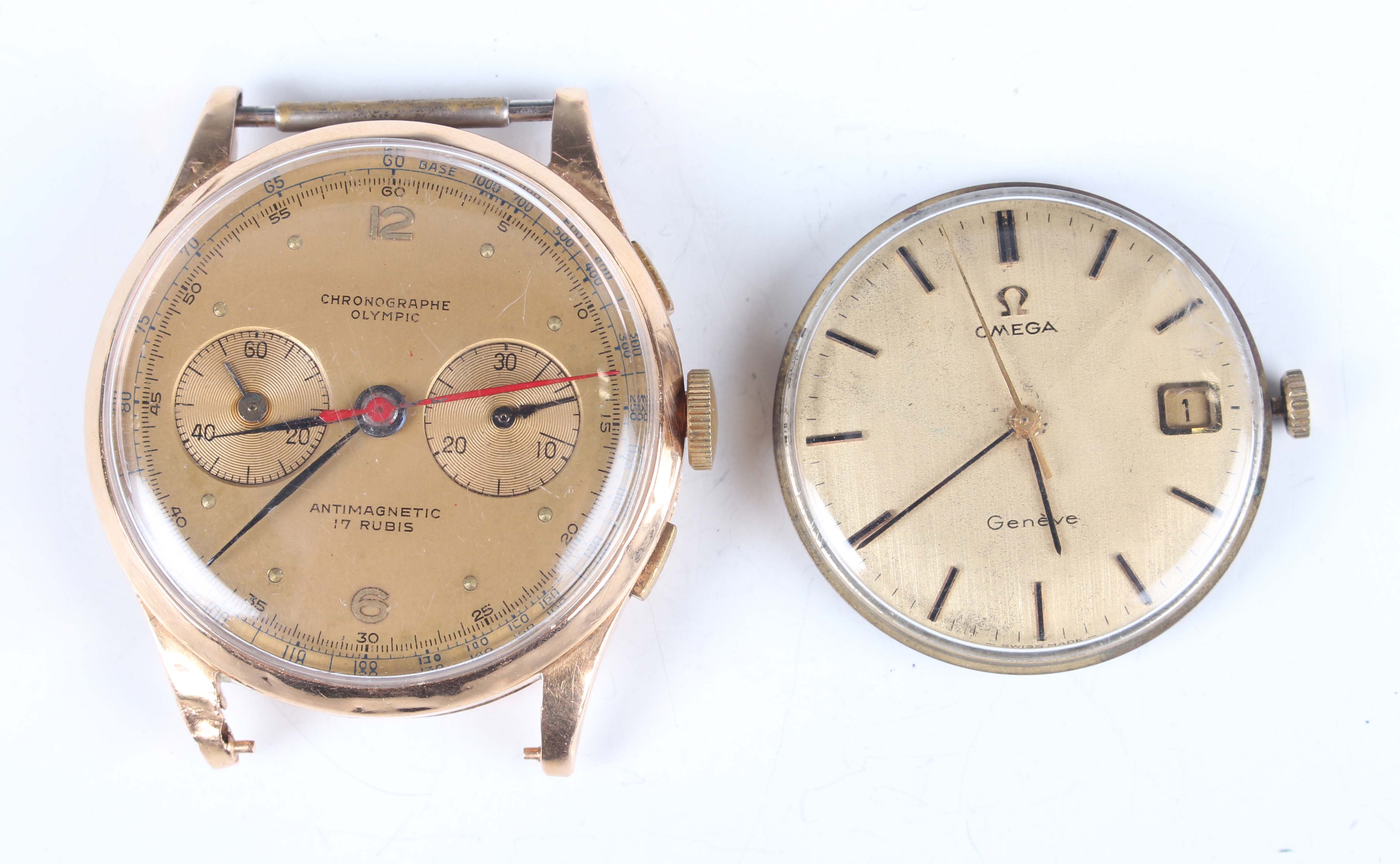 A Chronographe Olympic 18K gold circular cased gentleman's chronograph wristwatch with unsigned jewelled movement, the signed gilt dial with gilt Arabic numeral and dot hour markers, two subsidiary dials and outer telemeter scale, with gilt metal dust cover, the case back detailed '18K 0,750', total weight 36.7g, case diameter 3.7cm, together with an Omega Genève 613 caliber manual wind wristwatch movement and signed silvered dial.