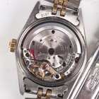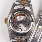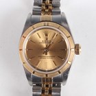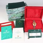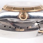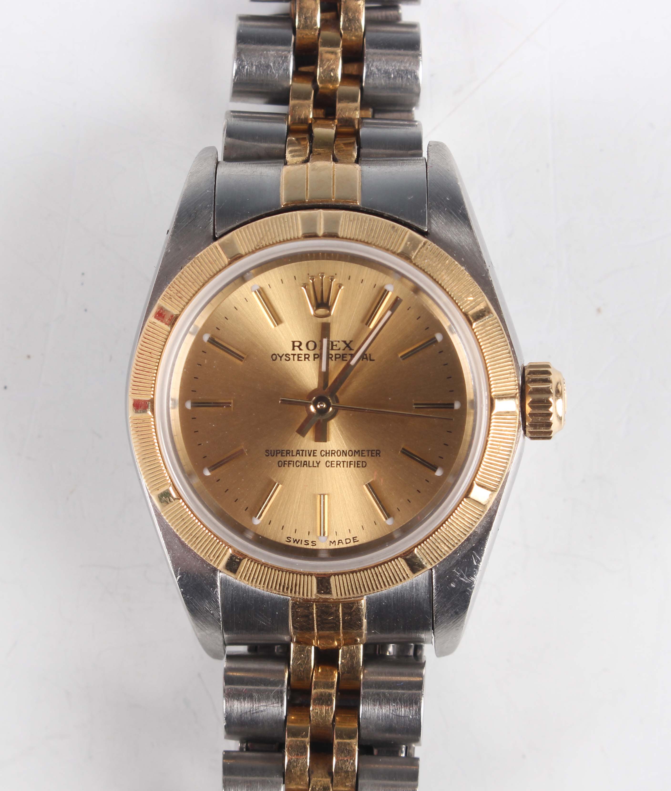 A Rolex Oyster Perpetual stainless steel and gold lady's bracelet wristwatch, Ref. 76233, circa 2000, with signed and jewelled movement, the signed gilt dial with baton hour markers, the case with milled bezel, the two colour tapering link Jubilee bracelet with signed foldover clasp, case width 2.5cm, with red Rolex box, outer card box and cover, booklets, wallet, chronometer certificate, dated '10-12-02', service guarantee card, Rolex pouch and spare link.