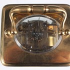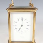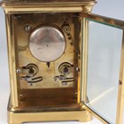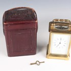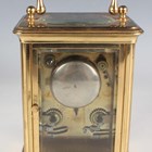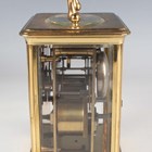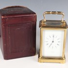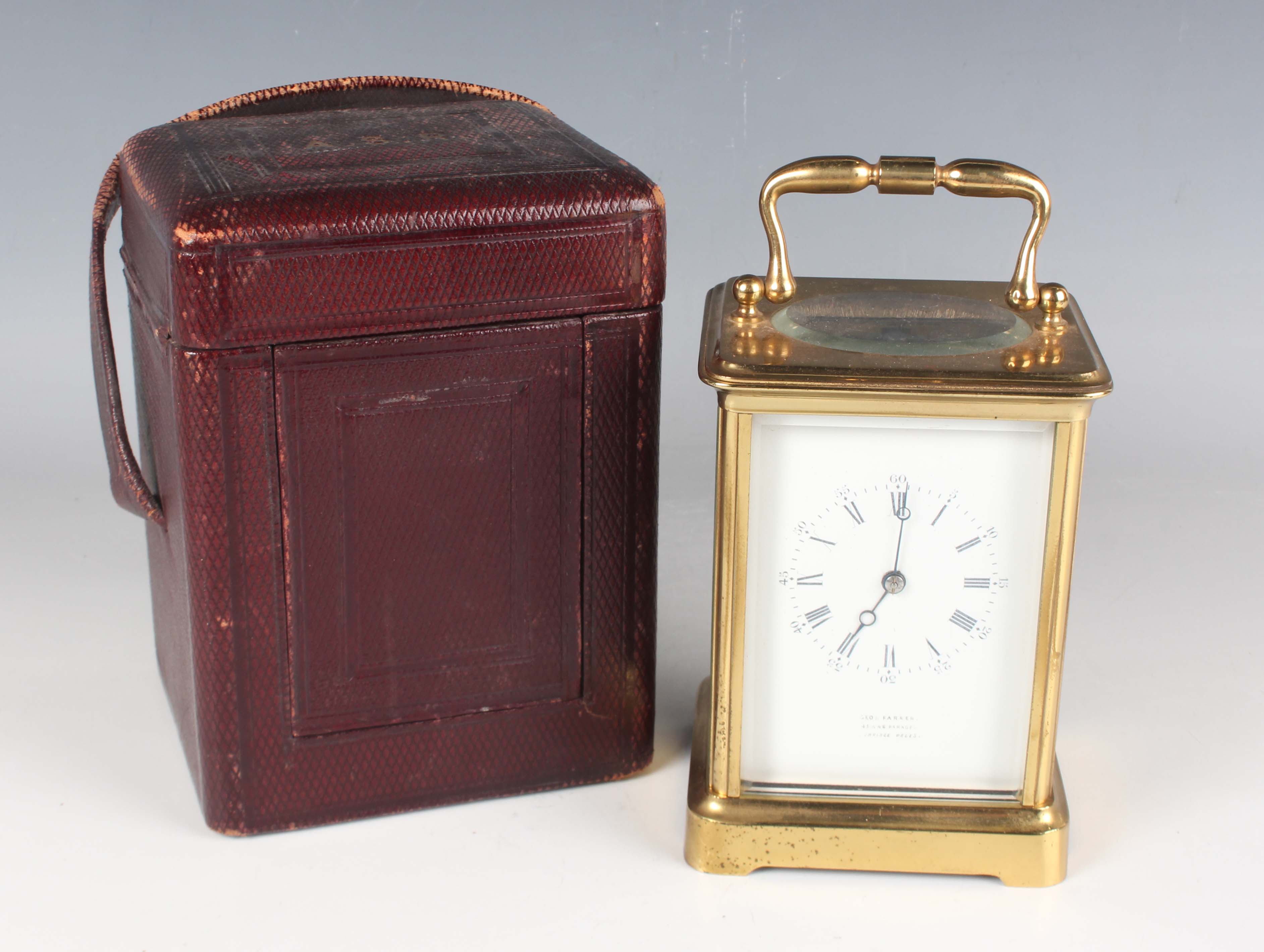 A late 19th century French lacquered brass corniche cased carriage clock, the eight day movement with platform escapement striking hours and half hours on a bell, the white enamelled dial with black Roman hour numerals and outer Arabic minutes, detailed 'Geoe Farrer 43 & 46 Parade Tunbridge Wells', the case with swing handle and glazed panels, height 17cm, with leather mounted travelling case and a winding key.