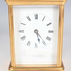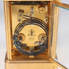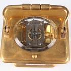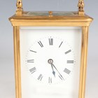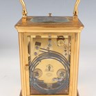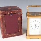 A late 19th century French lacquered brass corniche cased carriage clock by Richard & Cie, the eight day movement with platform escapement striking and repeating on a gong, the white enamelled dial with black Roman hour numerals, the case with swing handle and bevelled glass panels, height 17.4cm, with travelling case.