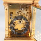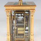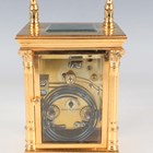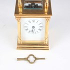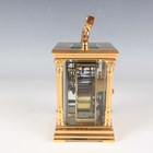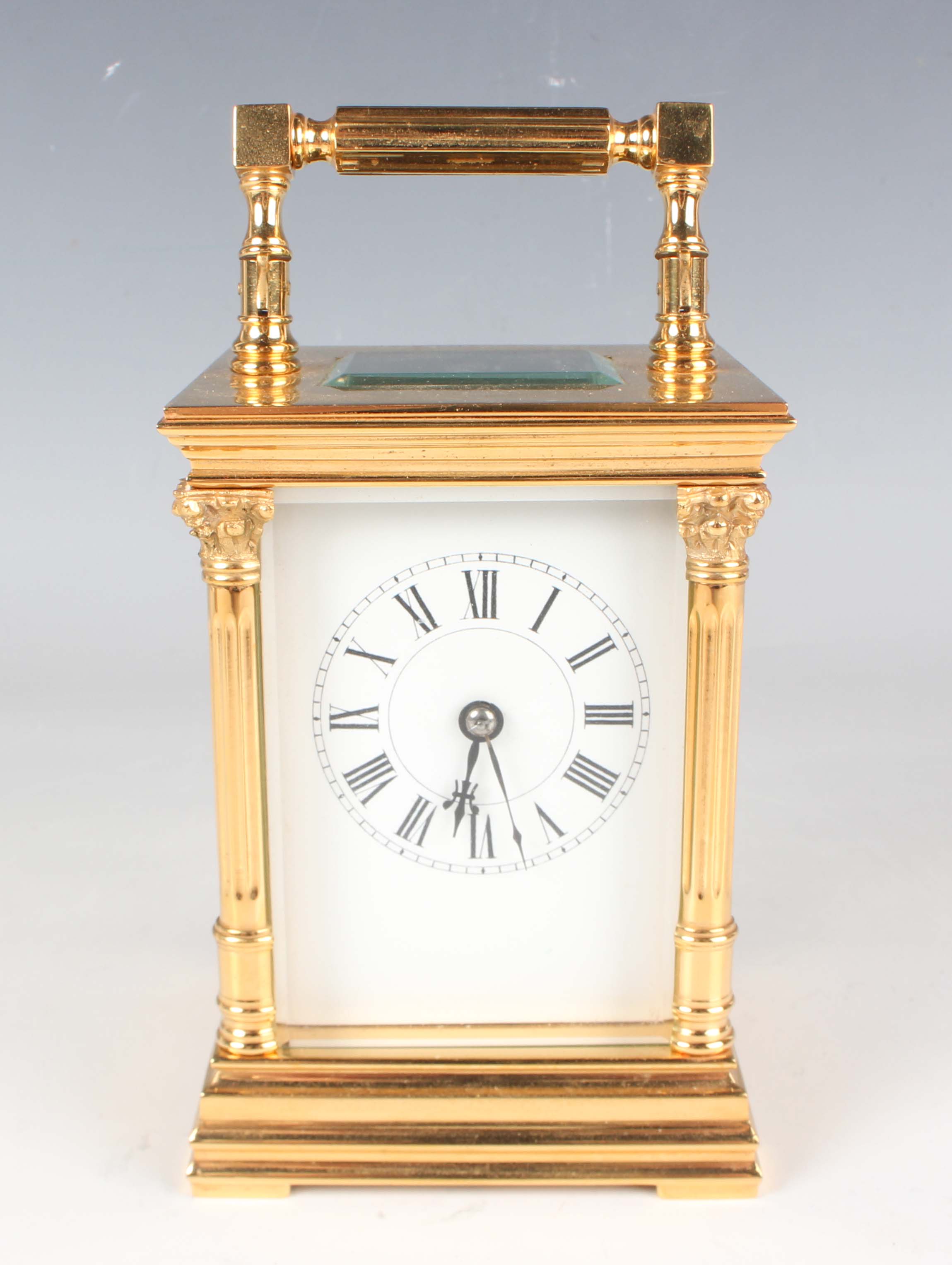 A late 19th/early 20th century French lacquered brass carriage clock, the eight day movement with platform escapement striking on a gong, the white enamelled dial with black Roman hour numerals, the case with fluted handle and Corinthian columns, on a stepped base, height 15.8cm, with winding key.