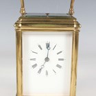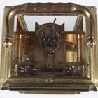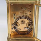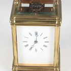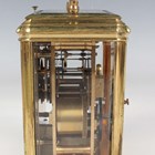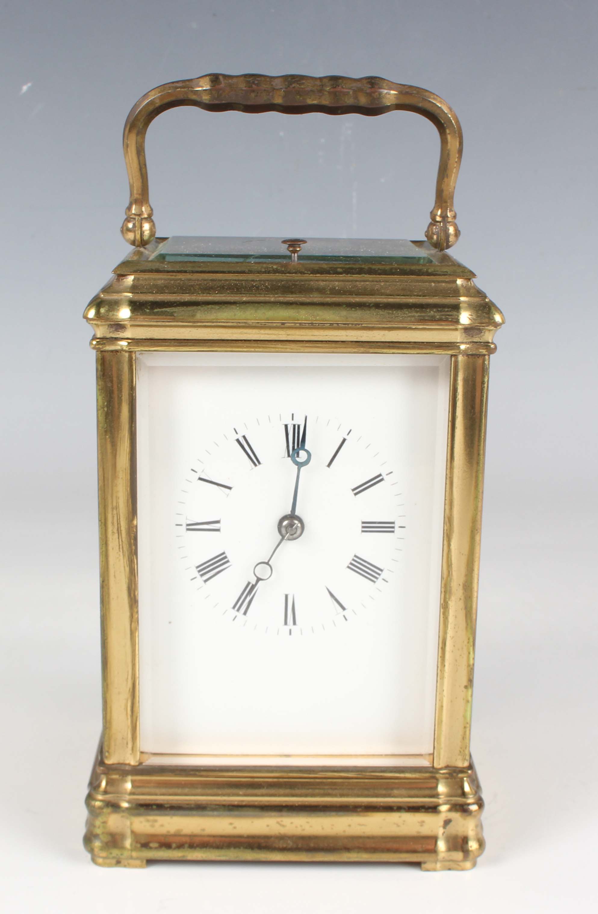 A late 19th century French lacquered brass gorge cased carriage clock, the eight day movement with platform escapement striking and repeating on a gong, the white enamelled dial with black Roman hour numerals, the case with swing handle and bevelled glass panels, height 17cm, with winding key.