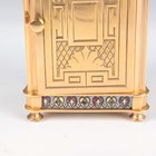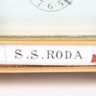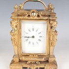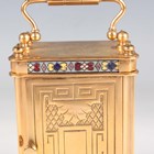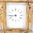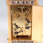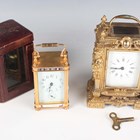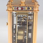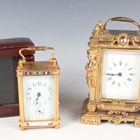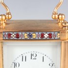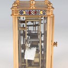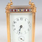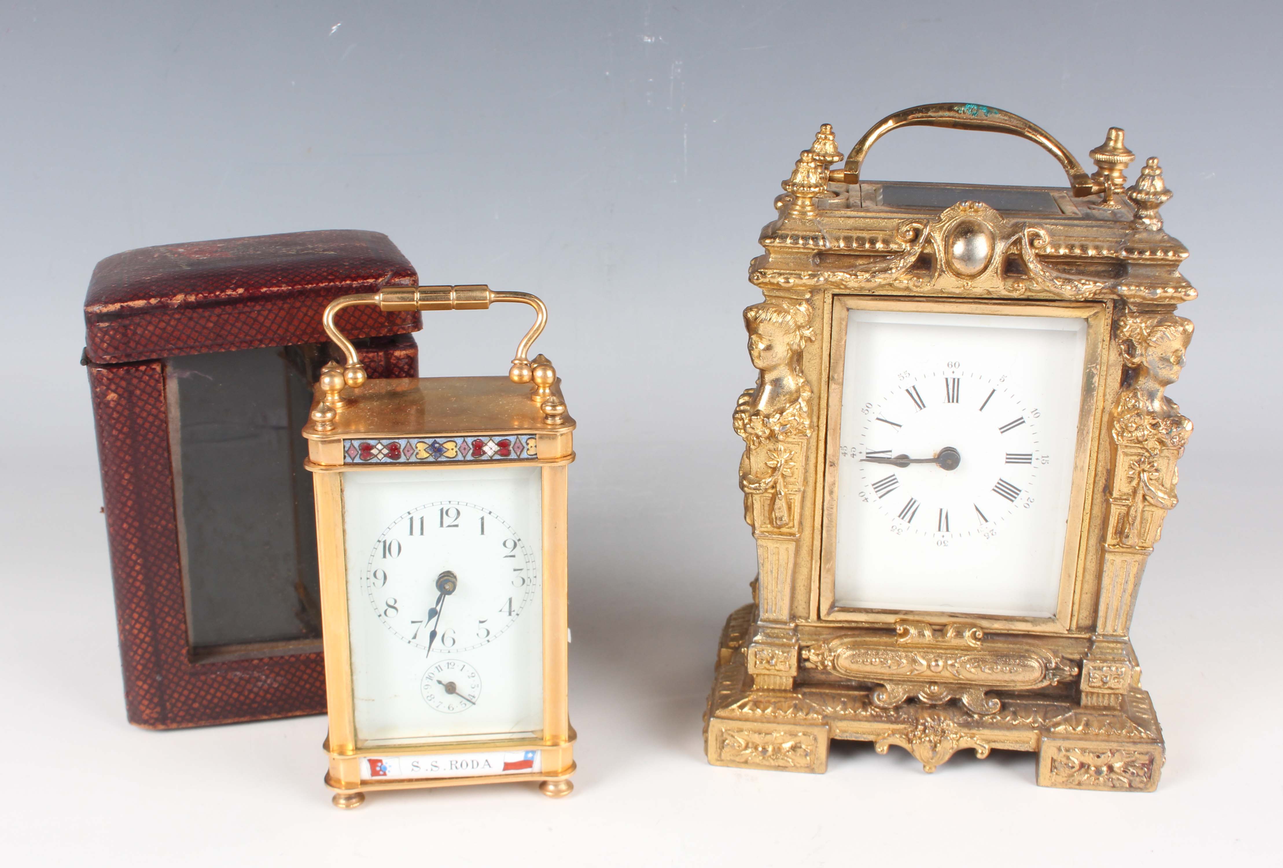 An early 20th century French lacquered brass and cloisonné enamel cased carriage alarm clock, the white enamelled dial with black Arabic hour numerals and subsidiary alarm dial, the case with swing handle above a cloisonné band and bevelled glass panels, the front with enamelled panel inscribed 'S.S. Roda' between two flags, height 12.5cm, with travelling case, together with a gilt spelter cased carriage timepiece, height 17cm.