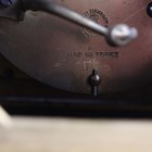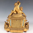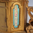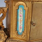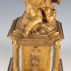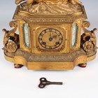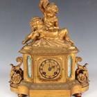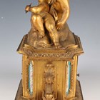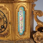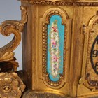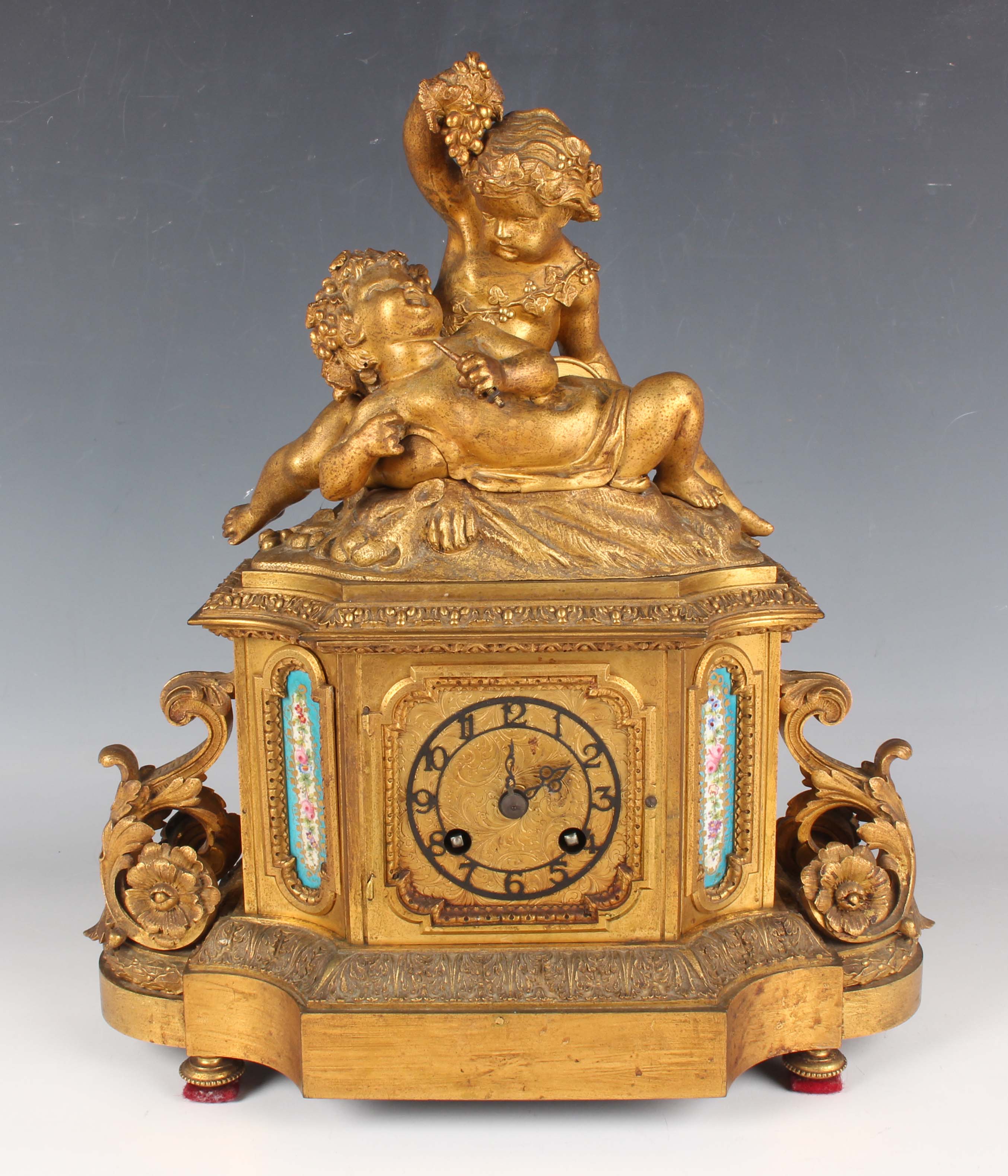 A late 19th century French ormolu and Sèvres style porcelain mantel clock, the eight day movement with platform escapement striking on a bell, the backplate with Japy Frères maker's stamp, the foliate engraved dial with applied skeletonized black chapter ring with Arabic hour numerals, the case surmounted with a pair of putti above four inset porcelain panels painted with flowers within gilt and bleu céleste borders, flanked by a pair of cast foliate scrolls, on a breakfront base with toupie feet, height 35cm, with winding key.
