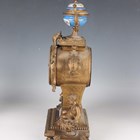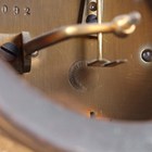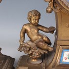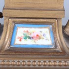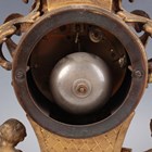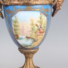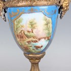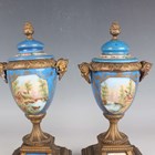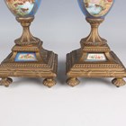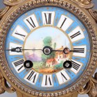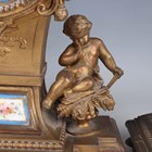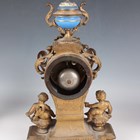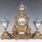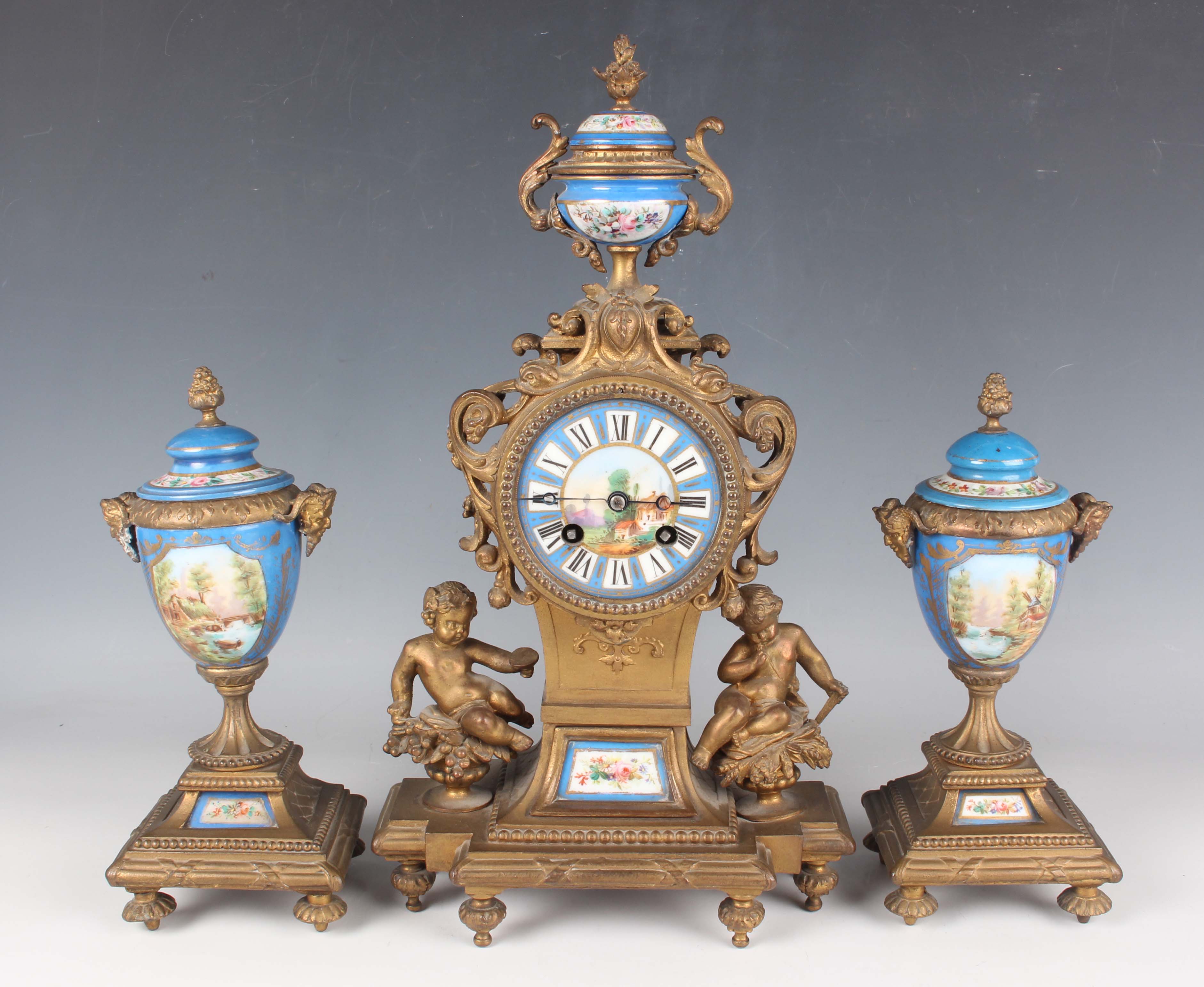 A late 19th century French gilt spelter and Sèvres style porcelain mantel clock garniture, the clock with eight day movement striking on a bell, the case with urn surmount above foliate scrolls and a pair of seated putti, height 38cm, with pendulum (urn surmount detached), flanked by a pair of similarly decorated urns, each porcelain body painted with a landscape within gilt and bleu céleste borders, height 24.5cm.