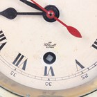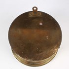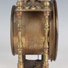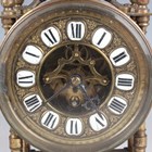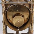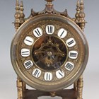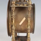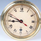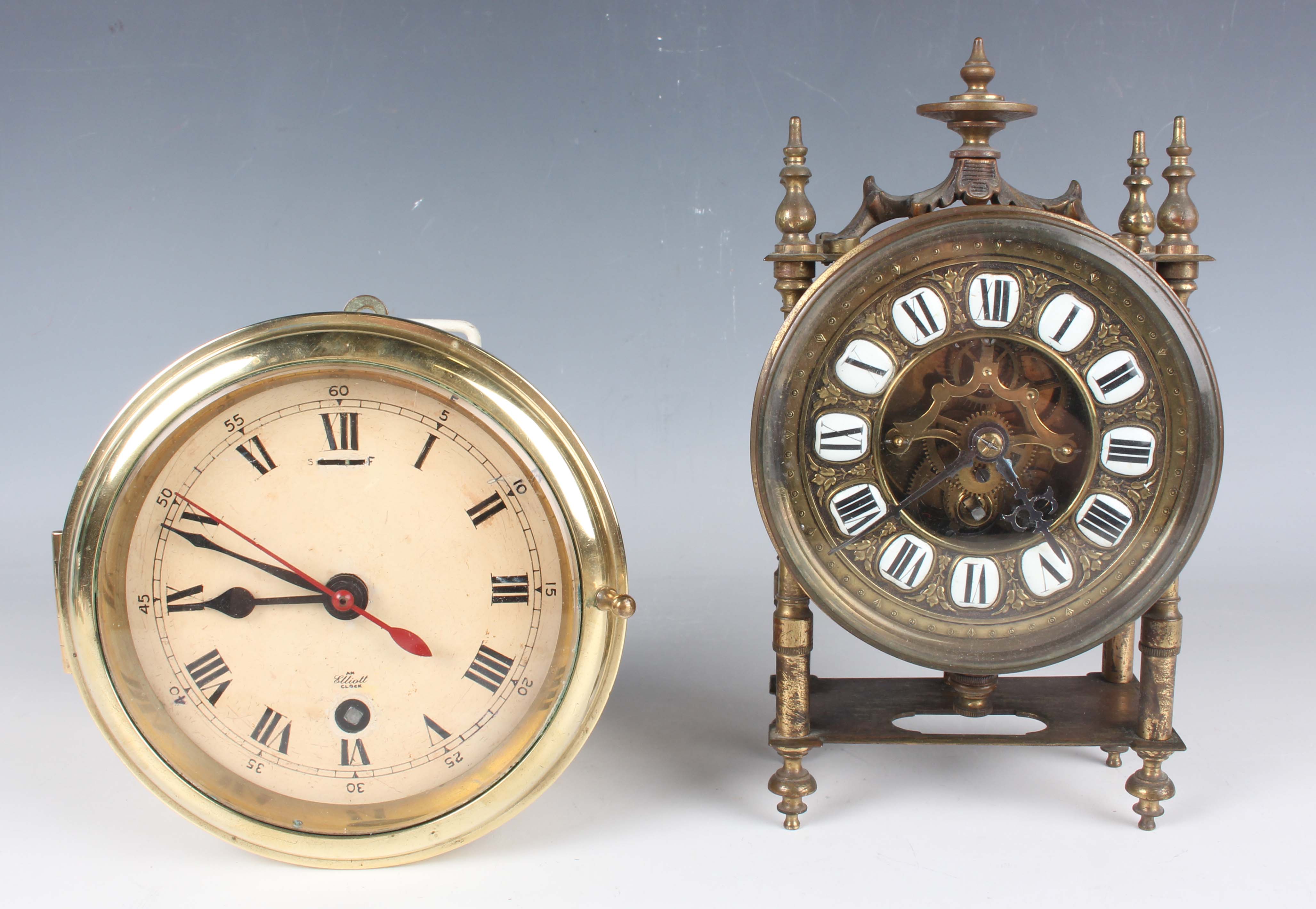 A 20th century brass circular cased ship's style timepiece, the movement with platform escapement and detailed 'Elliott London 2200', the 5-inch painted dial with black Roman hour numerals and slow/fast indicator and detailed 'An Elliott Clock', case diameter 15cm, with a winding key, together with a French brass cased mantel timepiece, the circular chapter ring with inset enamel hour plaques framing a visible skeletonized movement, on turned feet, height 22cm, with winding key.