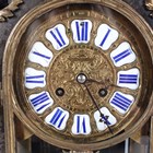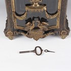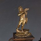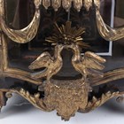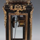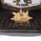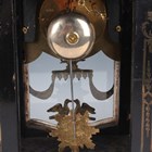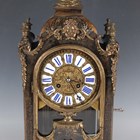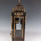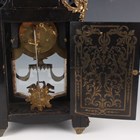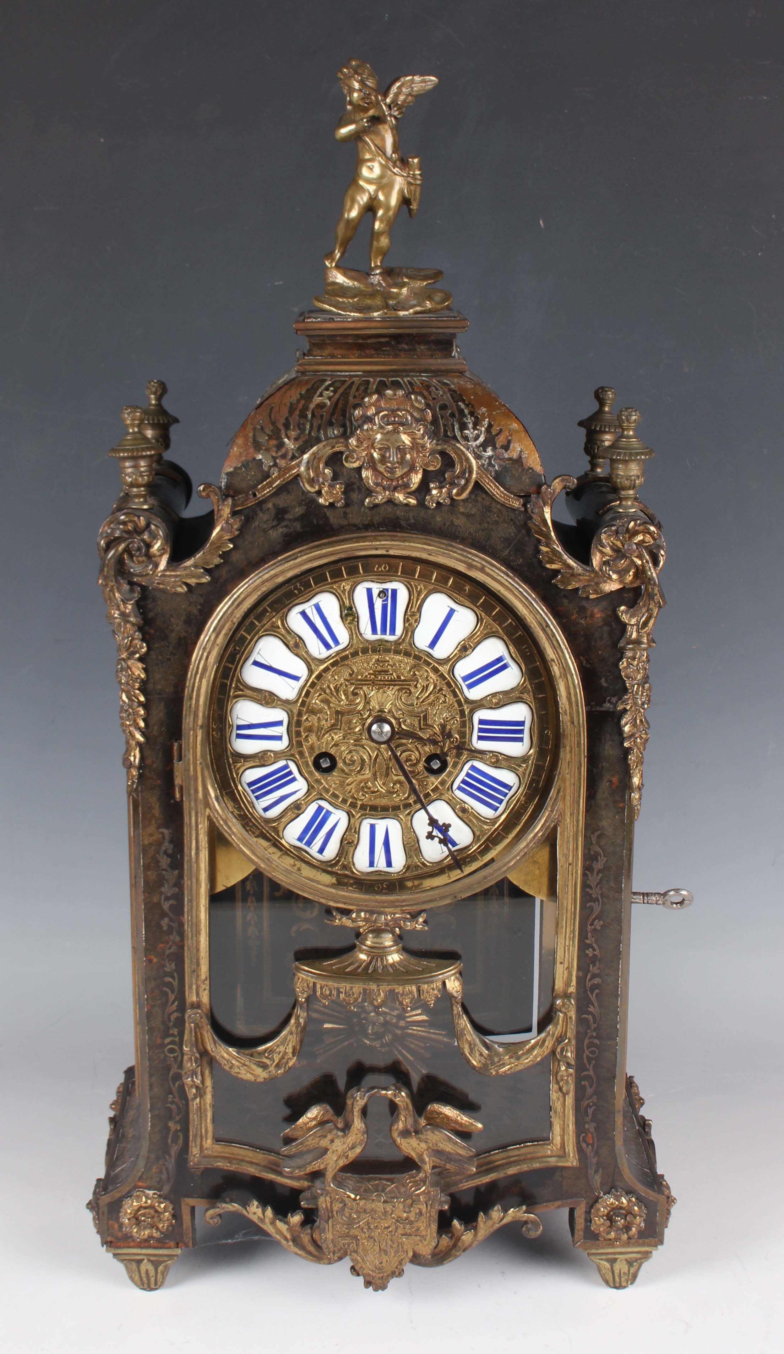 A late 18th century French gilt brass mounted ebonized and boulle work mantel clock with eight day movement striking on a bell, the embossed gilt dial inset with enamel hour plaques, the brass inlaid case surmounted with a figure of Cupid above urn finials, foliate scroll mounts, glazed front door and side panels, on foliate feet, height 50cm (some inlay loss), with pendulum, case key and winding key.