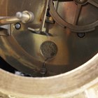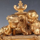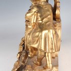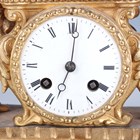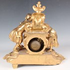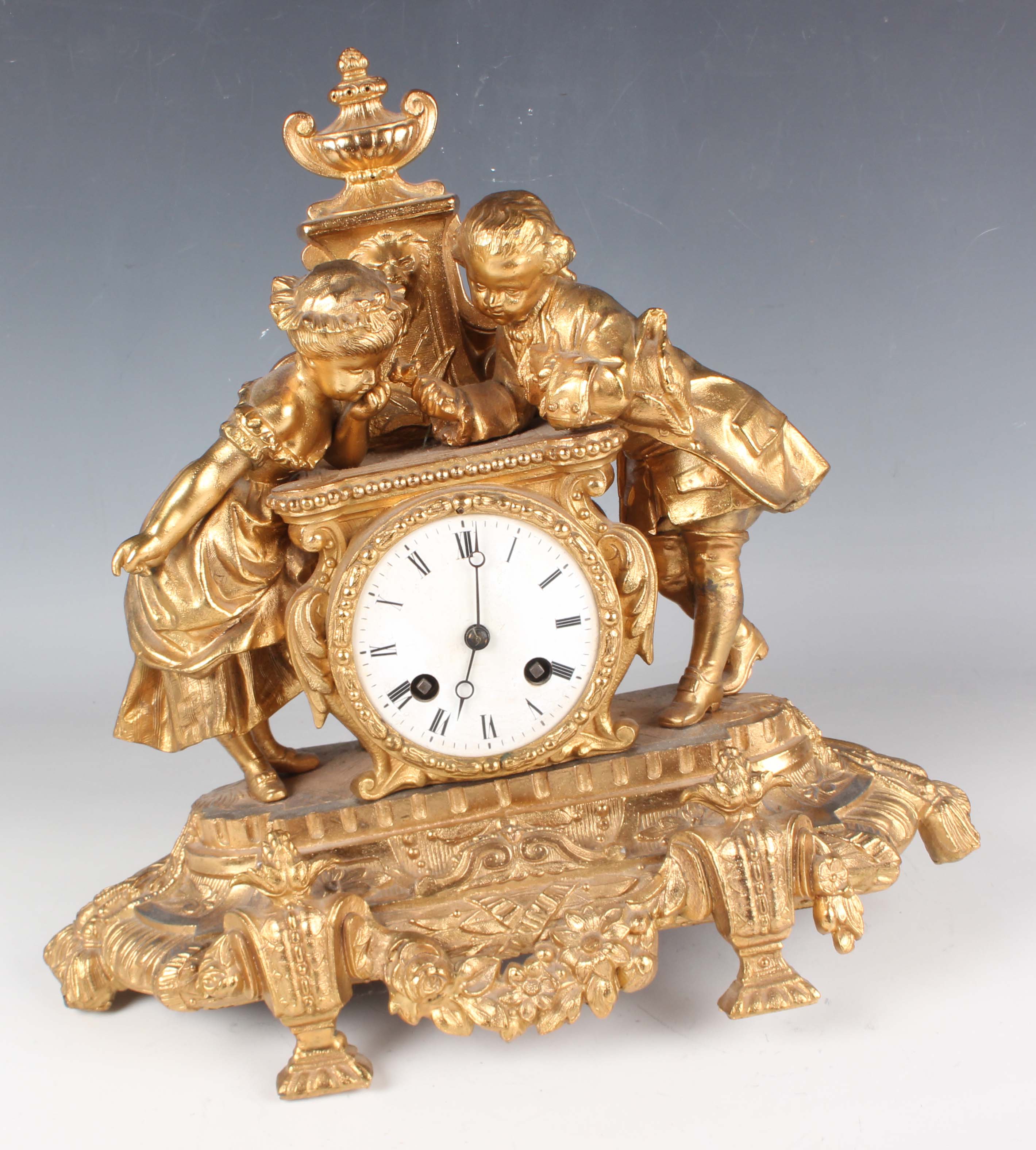 A late 19th century French gilt spelter mantel clock with eight day movement striking on a bell via an outside countwheel, the white enamelled dial with black Roman hour numerals, the case modelled with a boy and girl standing on a foliate moulded base, height 33cm, with pendulum (back foot detached).