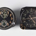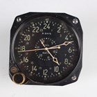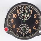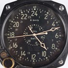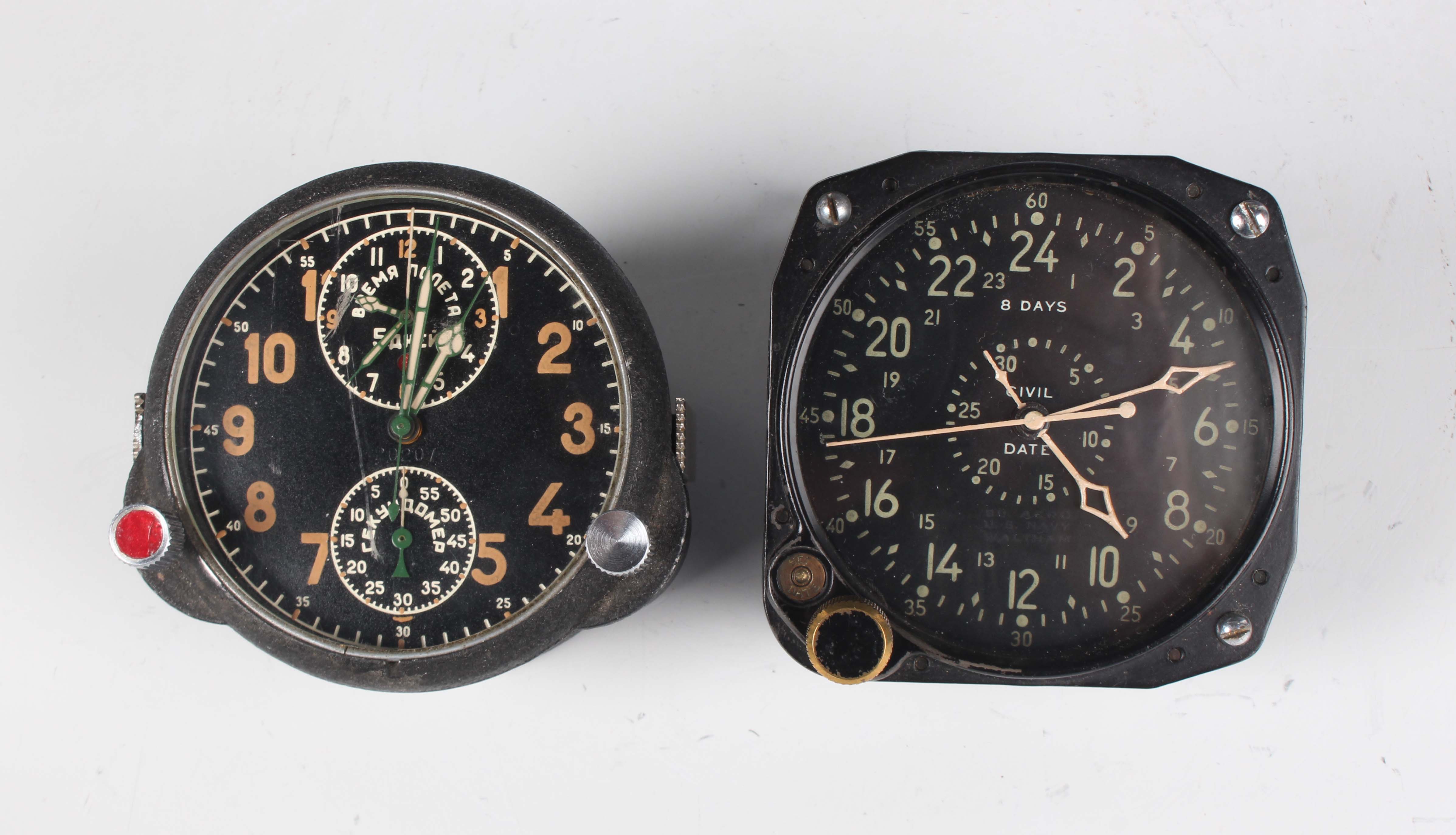 A Soviet military cockpit chronometer, probably from a Russian MiG or Su aircraft, the black dial with Arabic hour numerals, centre stop seconds and two subsidiary dials, case diameter 8.4cm, together with a Waltham US Navy Bu Aero black enamelled cased cockpit timepiece, the signed black dial with luminous Arabic numerals, inner date dial and centre seconds, detailed '8 days Civil Date', cased width 8.2cm. Note: the Waltham Civil Date indicator timepiece were standard for many Second World War period US Navy aircraft, including the Grumman and Eastern Aircraft TBF and TBM Avenger torpedo bombers, Consolidated PBY flying boat and amphibious aircraft and the Martin PBM Mariner patrol bomber flying boat.