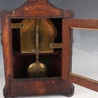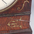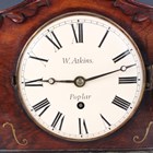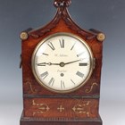 A Regency brass inlaid rosewood mantel timepiece with eight day single fusee movement, the 6-inch painted circular dial with black Roman hour numerals and inscribed 'W. Atkins Poplar', the case with trefoil surmount above applied foliate scroll mouldings, gilt rosettes and a pair of brass loose ring handles, on a rectangular base and bun feet, height 38.7cm, with pendulum. Note: W. Atkins is a recorded London clockmaker, working in Poplar in the early 19th century.