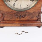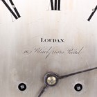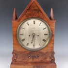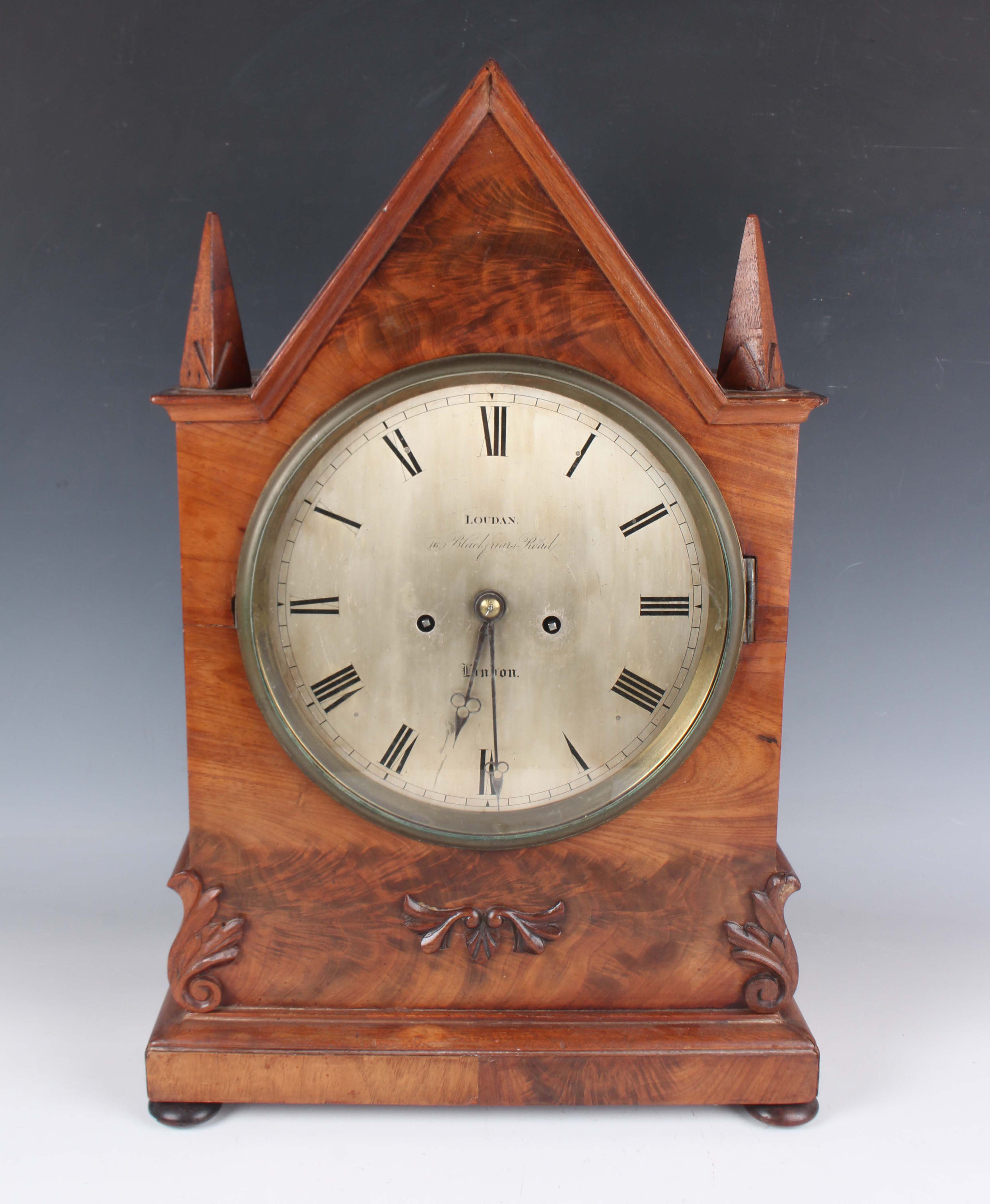An early Victorian mahogany bracket clock with eight day twin fusee movement striking on a bell, the 7½-inch circular silvered dial with black Roman hour numerals and inscribed 'Loudan. 16 Blackfriars Road London', the Gothic arched case with applied foliate mouldings and pierced fret panels to sides, on a moulded rectangular base and bun feet, height 49cm, with pendulum. Note: William Loudan is a recorded London clockmaker working between 1825 and 1851.