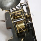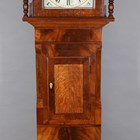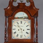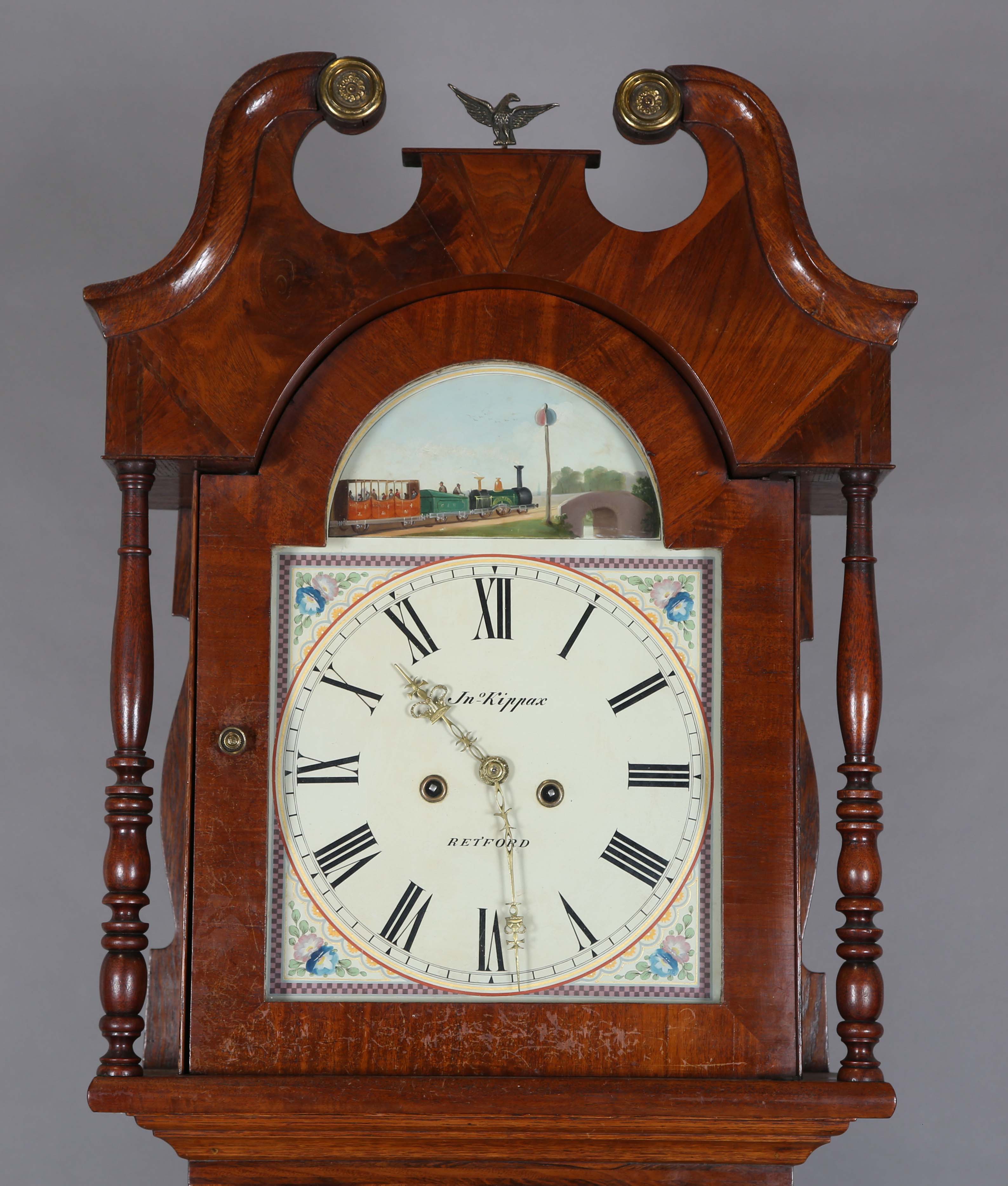 A Victorian oak and mahogany crossbanded longcase clock with eight day movement striking on a bell, the 13-inch painted breakarch dial decorated with a scene of a Grand Junction Railway (GJR) locomotive and carriages approaching a bridge, above black Roman hour numerals, and inscribed 'Jno Kippax Retford', the hood with swan neck pediment, glazed door and turned columns, the trunk with rectangular door, on bracket feet, height 229cm, with pendulum and two weights. Note: John Kippax is a recorded Nottinghamshire clockmaker working in East Retford between 1849 and 1876.