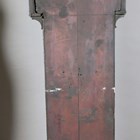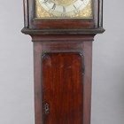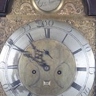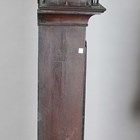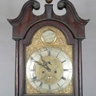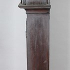 A George III oak longcase clock with eight day bell strike movement, the 13-inch brass breakarch dial with silvered chapter ring and date aperture beneath a silvered boss to the arch, inscribed 'Thos Pringle St. Ninians', the hood with swan neck pediment, turned columns and glazed door, the trunk with rectangular door, on a plain base and bracket feet, height 229cm (alterations and faults), with pendulum and two weights.