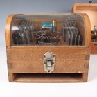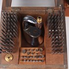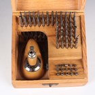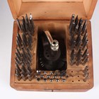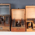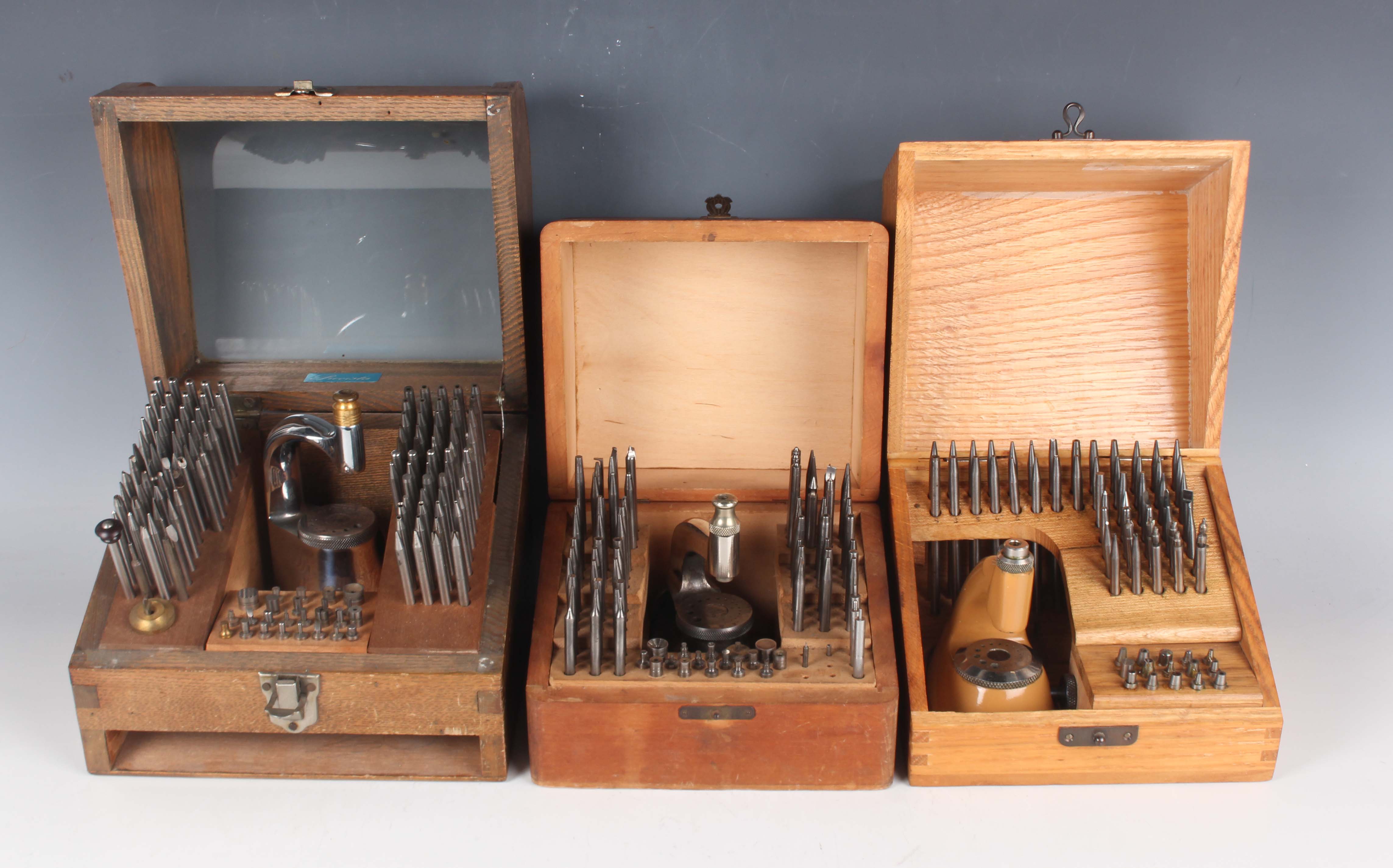 A Prescista standard staking tool set, within an oak and glazed case, height 16.3cm (missing frieze drawer), together with a Star staking tool set, cased, and another cased staking tool set.