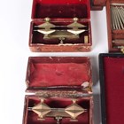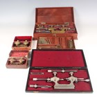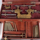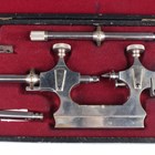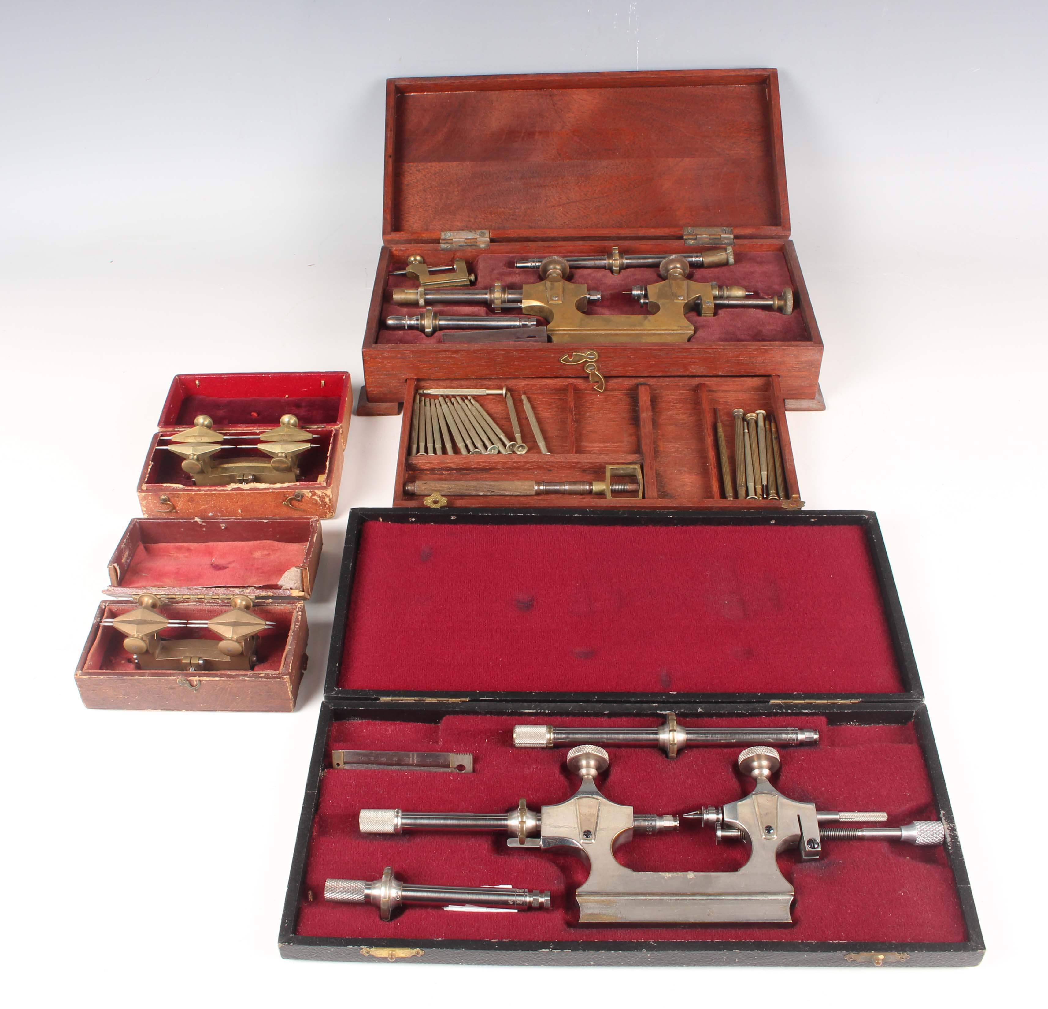 An early 20th century Swiss watchmaker's Jacot tool, stamped 'CS' with cockerel maker's mark, probably Carl Steiner, length 24.5cm, cased, together with a similar Jacot tool, stamped 'DL PP' with star and crescent maker's mark, length 24.4cm, with accessories, cased, and two brass and steel depthing tools, cased.