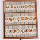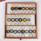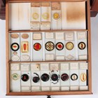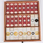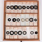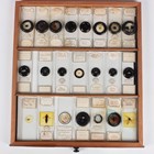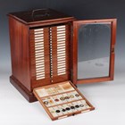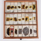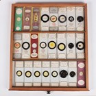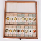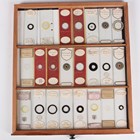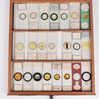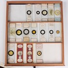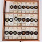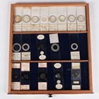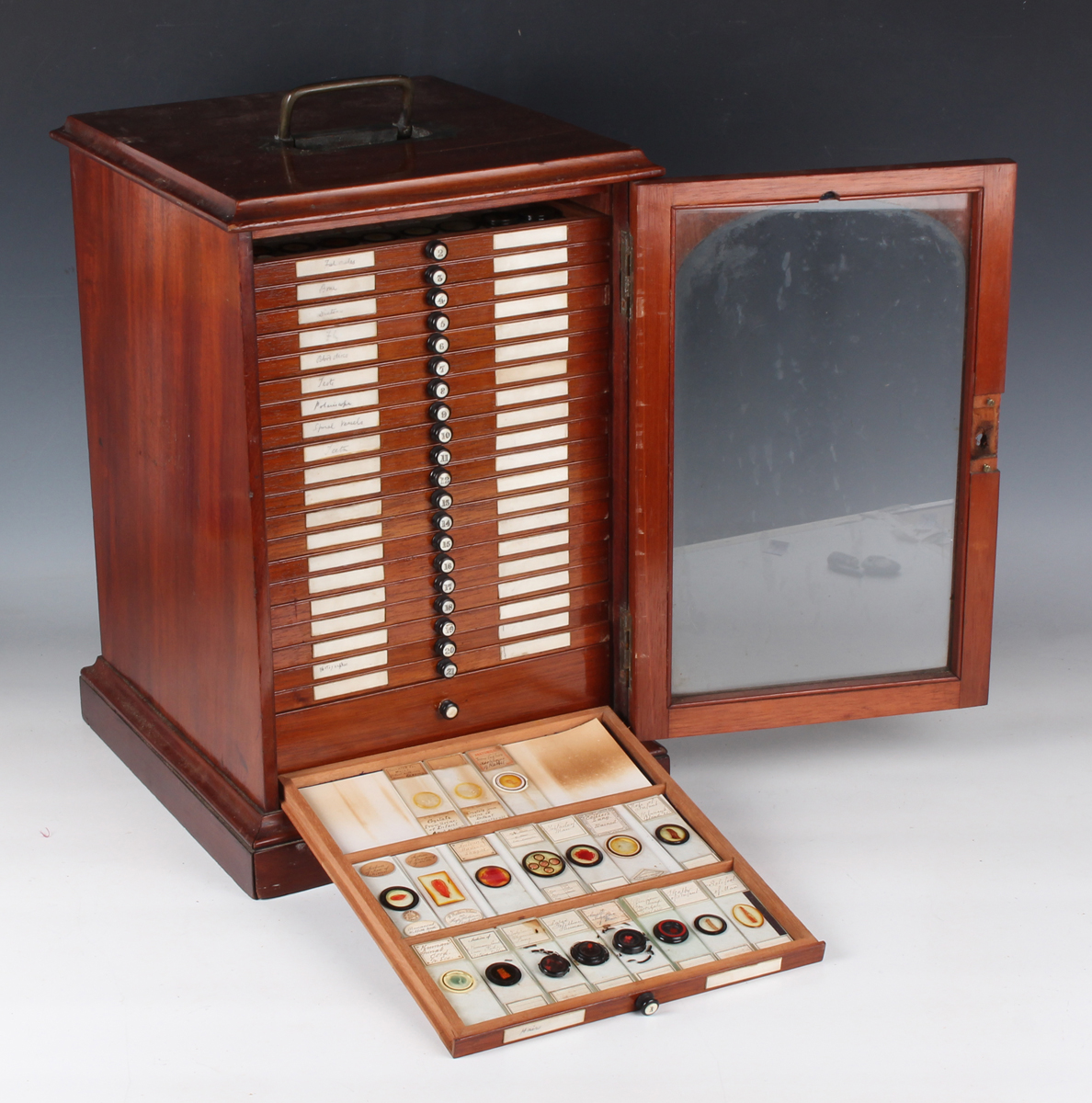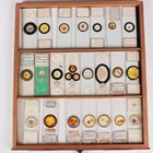 A collection of approximately four hundred and thirty-eight microscope specimen slides, mostly Victorian and later, including entomological, diatomaceous, botanical, geological, marine, zoological and biological, many with printed paper labels and some paper wrapped, including C.M. Topping, Arthur Cole with 1867 Paris prize medal labels, Arthur J. Doherty of Manchester, W. Watson & Sons, C.B. Crawshaw, Fred Enock, E. Bryan of Manchester, George Wilks and Edmund Wheeler, all housed within a late Victorian mahogany specimen chest of twenty-two drawers, enclosed by a glazed door, height 41.7cm.