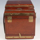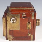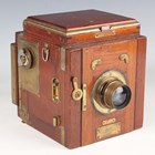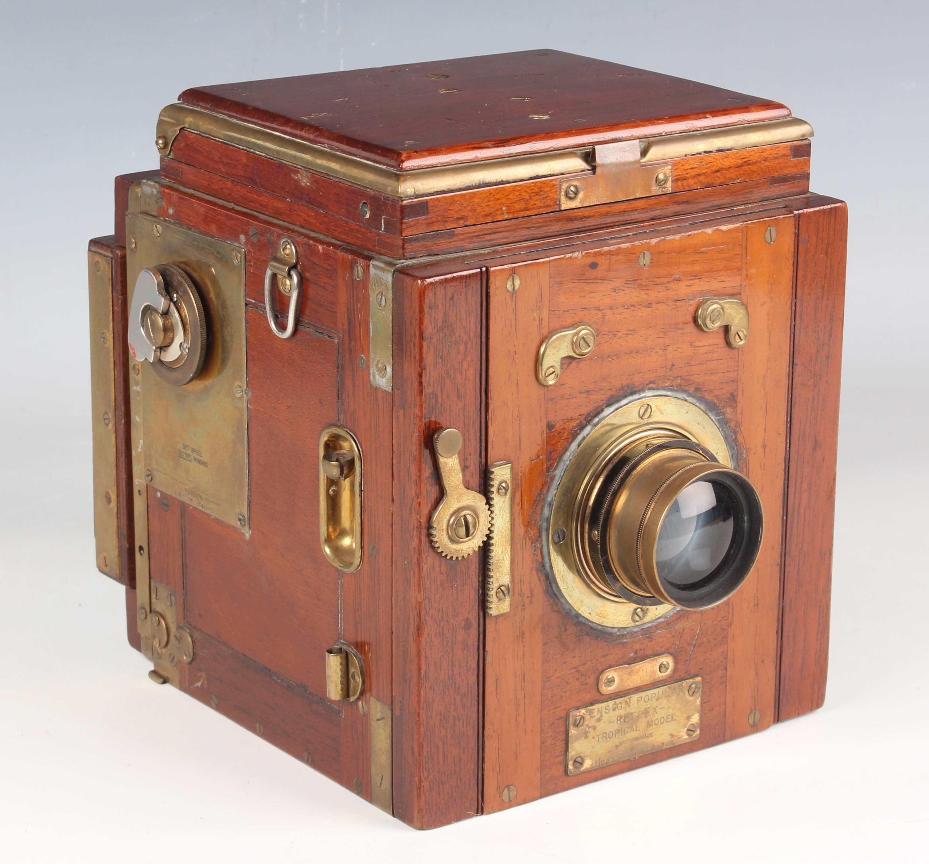 An early 20th century Houghtons Ltd teak and brass Ensign popular reflex tropical model three-quarter plate camera with Aldis Anastigmat patent lens, No. 3, No. 7825, height 18cm.