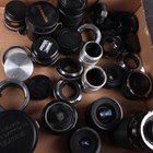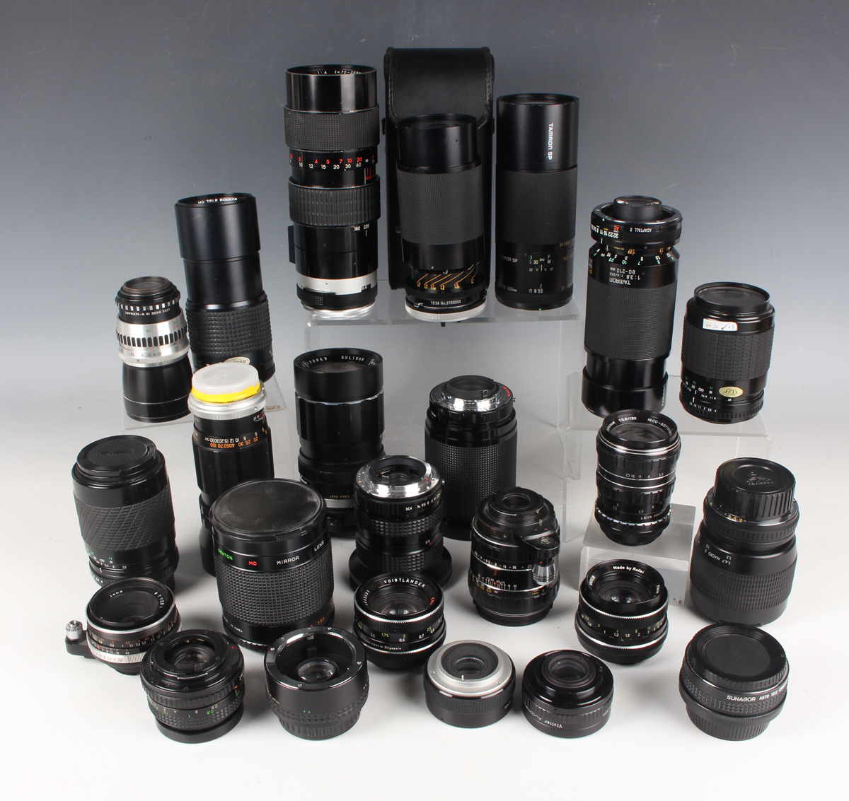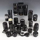 A collection of mostly 35mm camera lenses, including a Centon MC Mirror 1:8.0 f=500mm lens, a Sigma Zoom-BII 1:4-5.6 f=60-200mm lens, a Soligor Auto-Zoom 1:3.5 f=55-135mm lens, a Tamron 1:4 f=70-220mm zoom lens and other Tamron lenses.