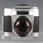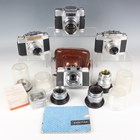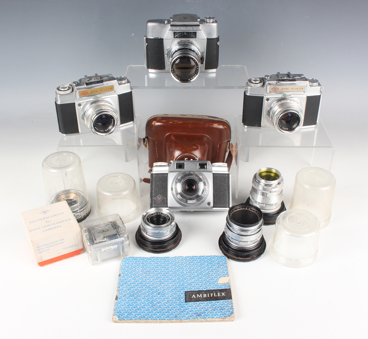 A small group of Agfa cameras, lenses and accessories, including an Ambiflex camera with Color-Telinear 1:4/135 lens, a Color-Telinear 1:4/90 lens, a Color-Ambion 1:4/35 lens, a Color-Solnar 1:2.8/50 lens and two Ambi-Silette cameras.