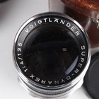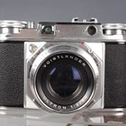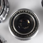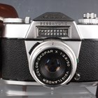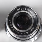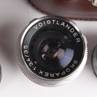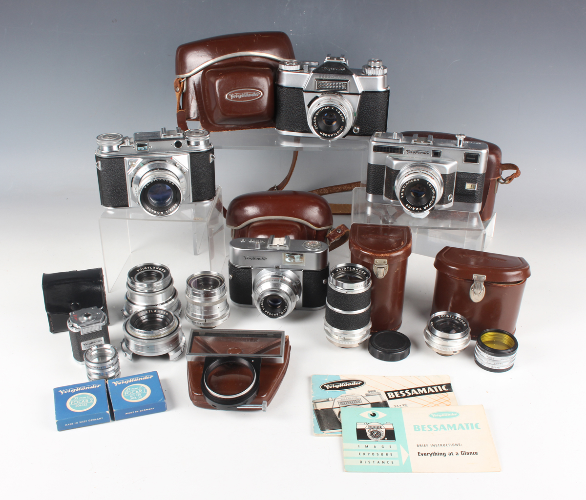 A small group of Voigtländer cameras, lenses and accessories, including a Prominent camera with Ultron 1:2/50 lens, a Dynaron 1:4.5/100 lens, a Skoparon 1:3.5/35 lens, a Dynaret 1:4.8/100 lens, a Skoparex 1:3.4/35 lens, cased, a Super-Dynarex 1:4/135 lens, cased, and a Vitessa T camera with Colour-Skopar 1:2.8/50 lens.