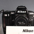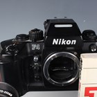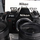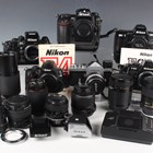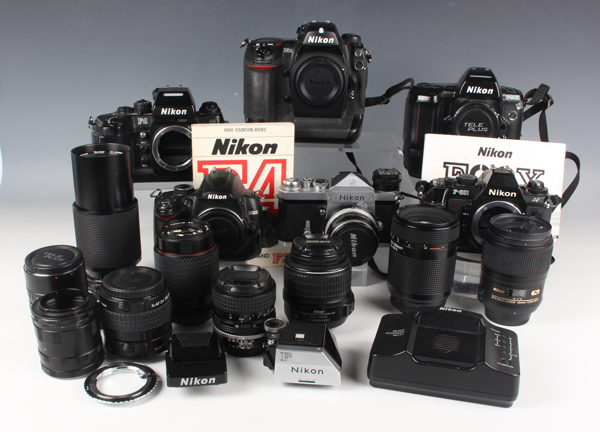A collection of Nikon cameras, lenses and accessories, including a Nikon F camera with Nikkor-H auto 1:2 f=50mm lens, an F-501 camera body, an F4 camera body, an AF Nikkor 70-210mm lens, an AF-S Nikkor 18-55mm lens, a Zoom-Nikkor 35-70mm lens and an AF-S Micro Nikkor 60mm lens, together with four other lenses, including a Vivitar 75-205mm zoom lens.