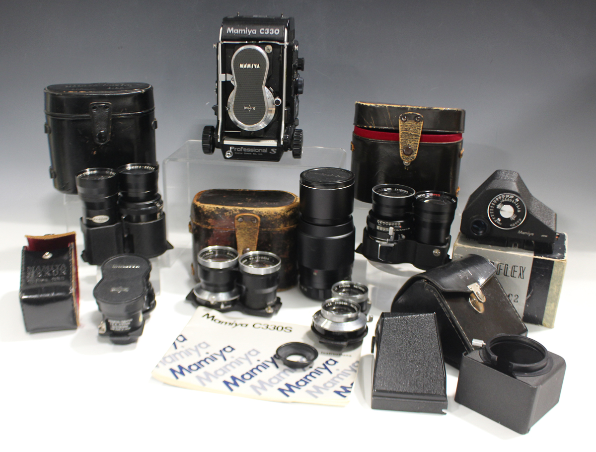 A Mamiya C330 Professional S twin lens reflex camera, Serial No. W204200, with Mamiya-Sekor 1:2.8 f=80mm lenses, together with a collection of other Mamiya accessories, including Mamiya-Sekor 1:6.3 f=250mm lenses, cased, Mamiya-Sekor 1:4.5 f=180mm lenses, cased, Mamiya-Sekor 1:4.5 f-135mm lenses, Mamiya-Sekor 1:3.5 f=65mm lenses, Mamiya-Sekor 1:3.5 f=105mm lenses, cased, and a Mamiya-Sekor Auto 1:3.5 f=200mm lens.