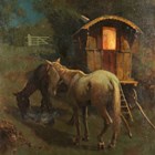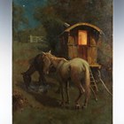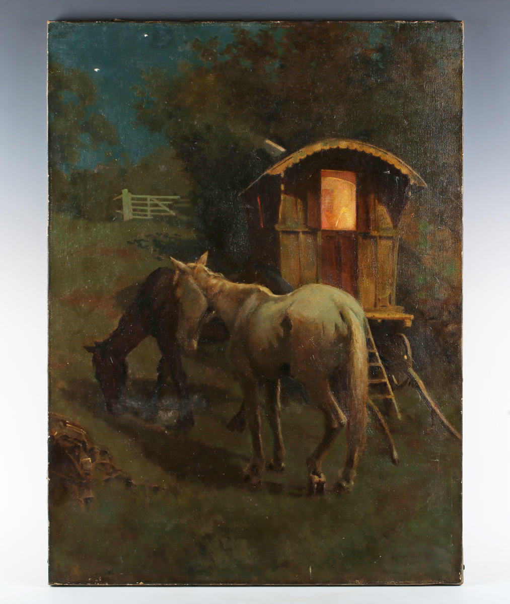 C?? Parnell (early 20th century) - Horses and gypsy caravan by night, oil on canvas, indistinctly signed and dated 1905 lower right, 76cm x 56cm, unframed.