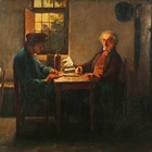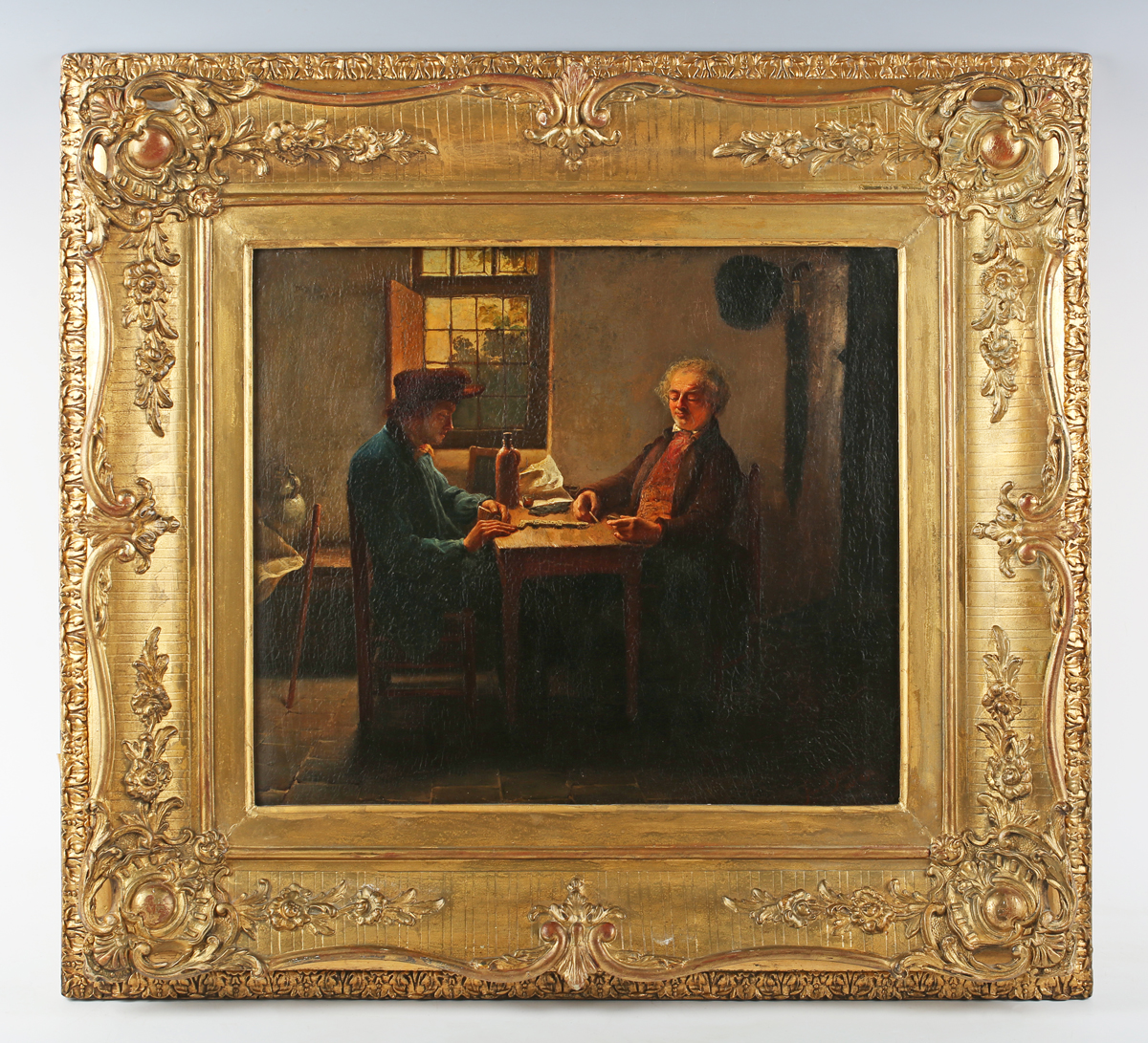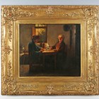 Frans Gons (Belgian 1834-1904) - A game of dominoes, oil on panel, signed and dated 1850 lower right, 36.5cm x 32cm, within a swept gilt composition frame.