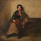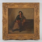 English School (19th century) - Young woman seated in an interior, oil on board, 30cm x 29.5cm, within a swept gilt composition frame.