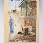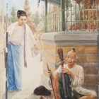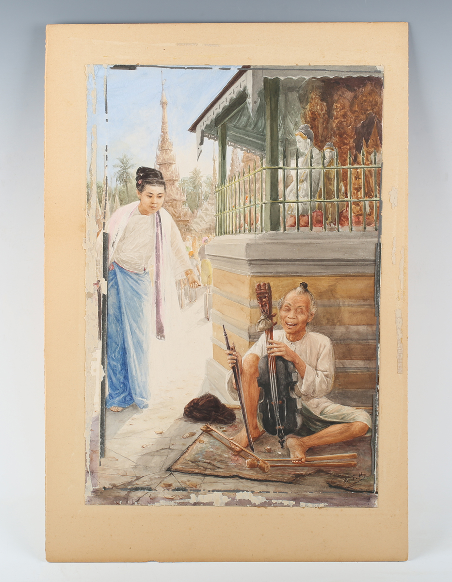 Mg Tun Hla (Burmese 1874-1946) - South-east Asian scene with a young woman handing a coin to a street musician, watercolour, signed with initials lower right, 45.5cm x 30.5cm, unframed.