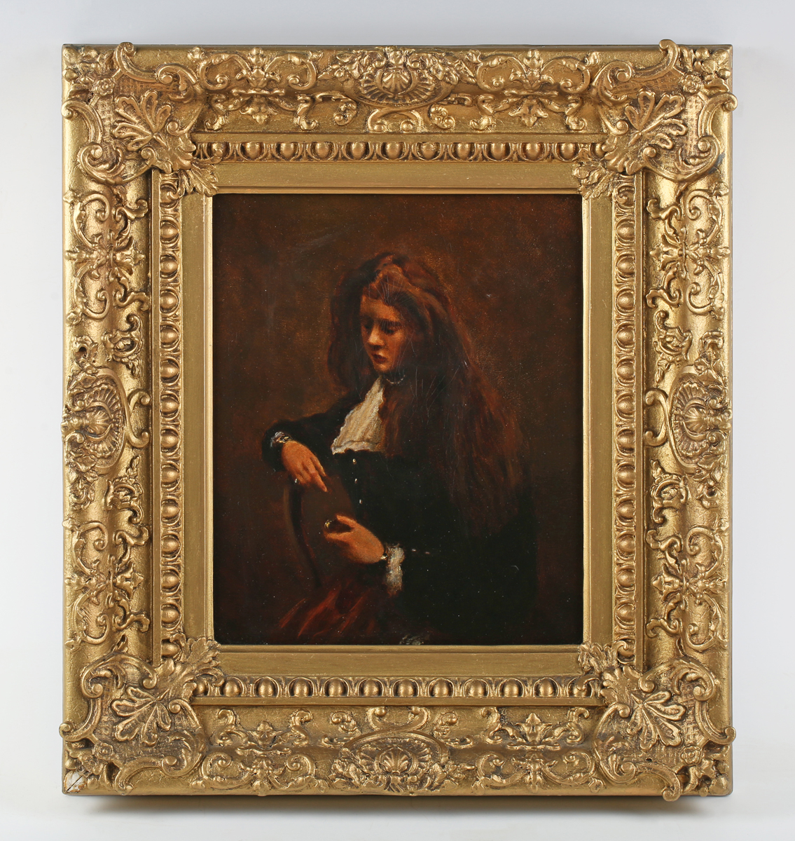 William Davison (19th century) - 'Miss Redhead with her long hair', oil on board, signed, inscribed and dated 'Durham Feb 1874' verso, further inscribed on stretcher bar, 28cm x 22.5cm, within a gilt composition frame of foliate design.