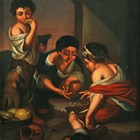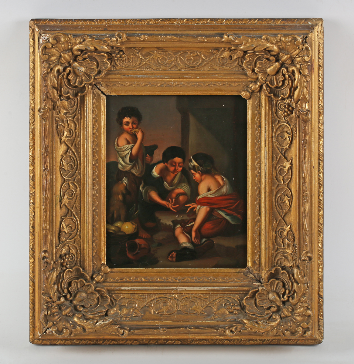 After Bartolome Esteban Murillo (Spanish 1617-1682) - Beggar boys playing dice, oil on board, 20cm x 16cm, within a swept gilt composition frame of foliate design.