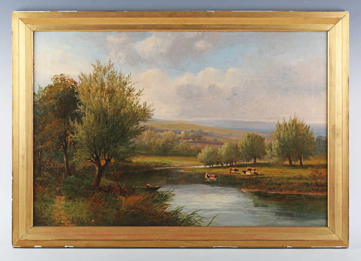C.B. Cotes (late 19th century) - Wooded river landscape with cattle, oil on canvas, signed lower left, 51cm x 76cm, within a plain gilt slip.