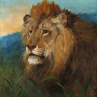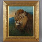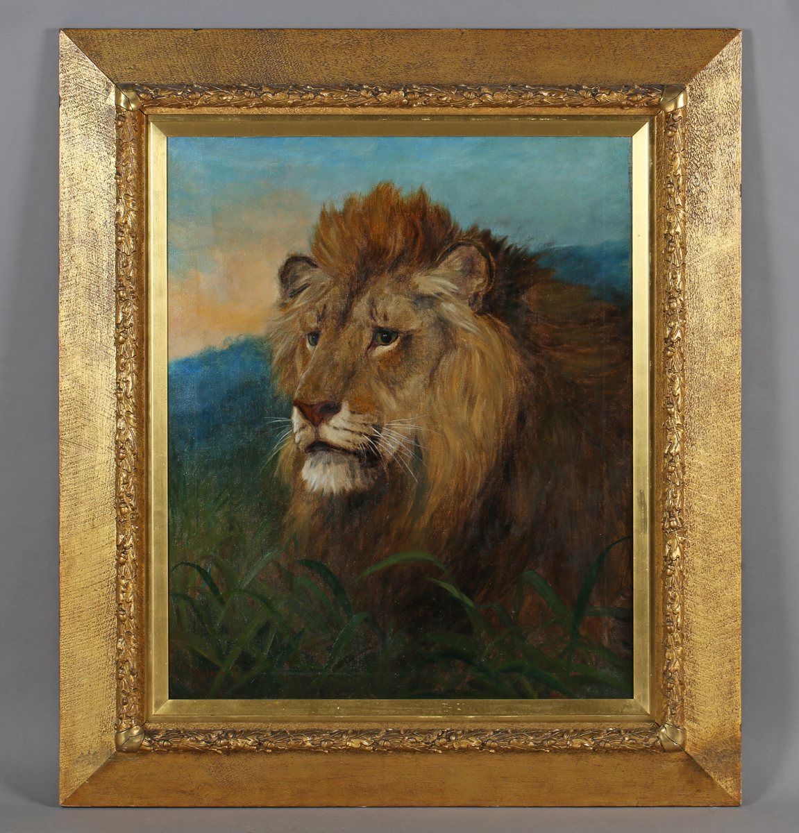 H. Dixon (late 19th/early 20th century) - Lion in repose, oil on canvas, 84cm x 69cm, within a gilded wood and composition frame with acorn and oakleaf motif.