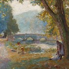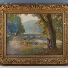 William Mainwaring Palin (British 1862-1947) - River landscape with bridge and girls on the riverbank, oil on canvas, 43.5cm x 59cm, within a gilt composition frame of foliate form.
