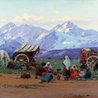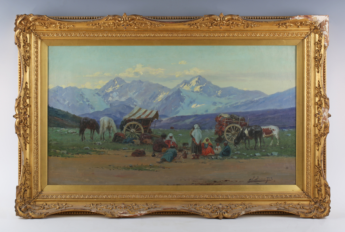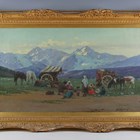 P. Bonnofol (19th/20th century) - Wagon train in a mountainous landscape, oil on canvas, signed lower right, 39cm x 70cm, within a swept gilt composition frame.