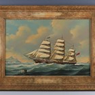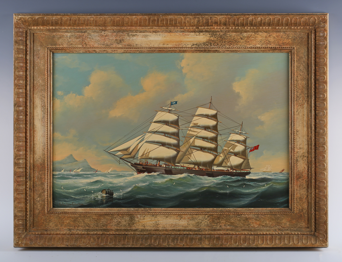 Salvatore Colacicco (Italian b.1935) - ‘Margaret Galbraith of Portugal’: clipper ship off the coast, oil on panel, signed lower left, inscribed with title on frame verso, 41cm x 60cm, within a stipple-painted composition Watts style frame.