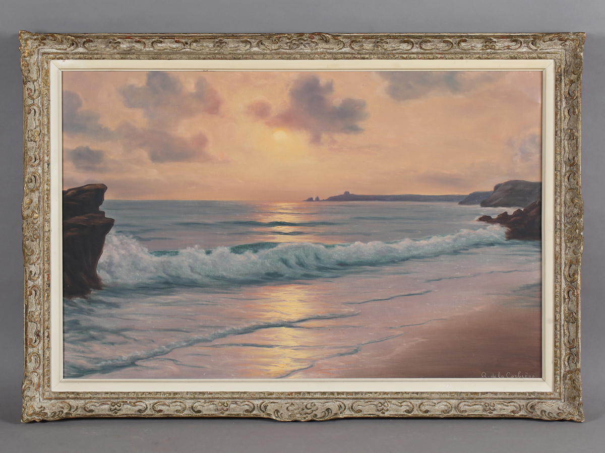 Roger de la Corbière (French 1893-1974) - Breaking waves, oil on canvas, signed lower right, 60cm x 91cm, within a gilt and painted composition frame. Provenance: Stacy-Marks.