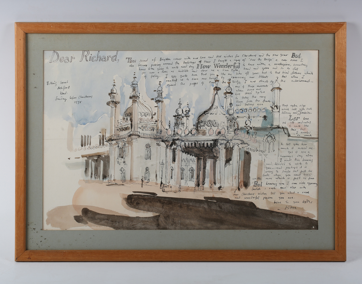 John Stanton Ward (British 1917-2007) - ‘The Pavillion Brighton’, pen, ink and watercolour, extensively inscribed, 30cm x 46cm, within a wood frame.