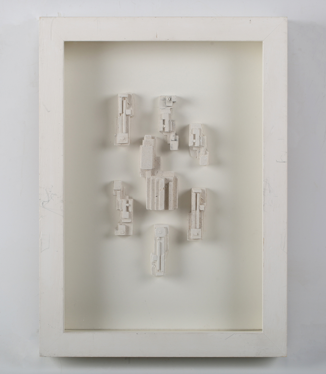 Eduardo Paolozzi (Scottish 1924-2005) - Composition, plaster relief on a white background 26cm x 17.5cm, within a white painted frame.