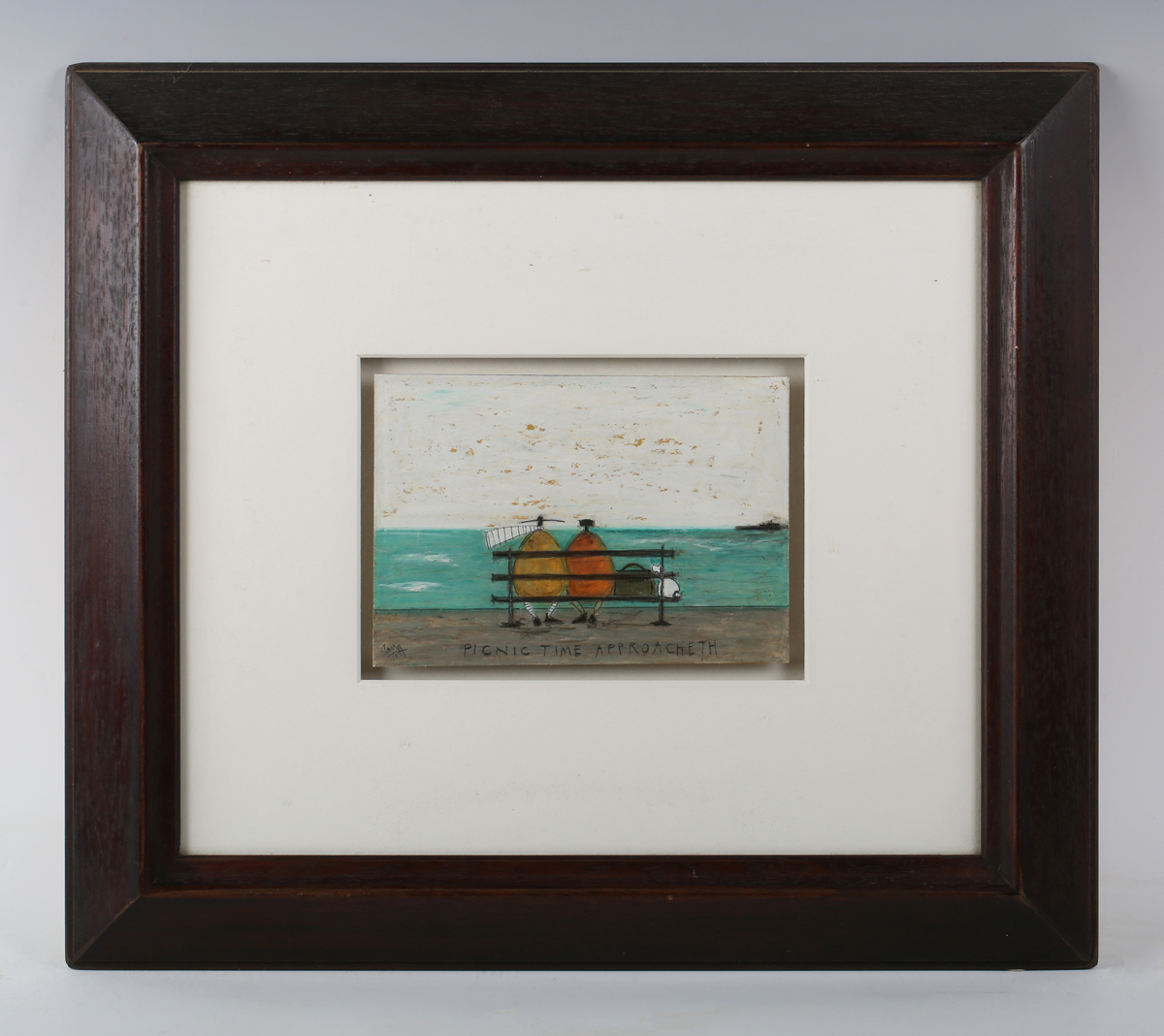 Sam Toft (British b. 1964) - ‘Picnic Time Approacheth’, pencil and mixed media, 15cm x 20.5cm, within a stained wood frame, with a dedicated card verso from the artist.