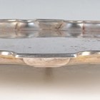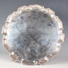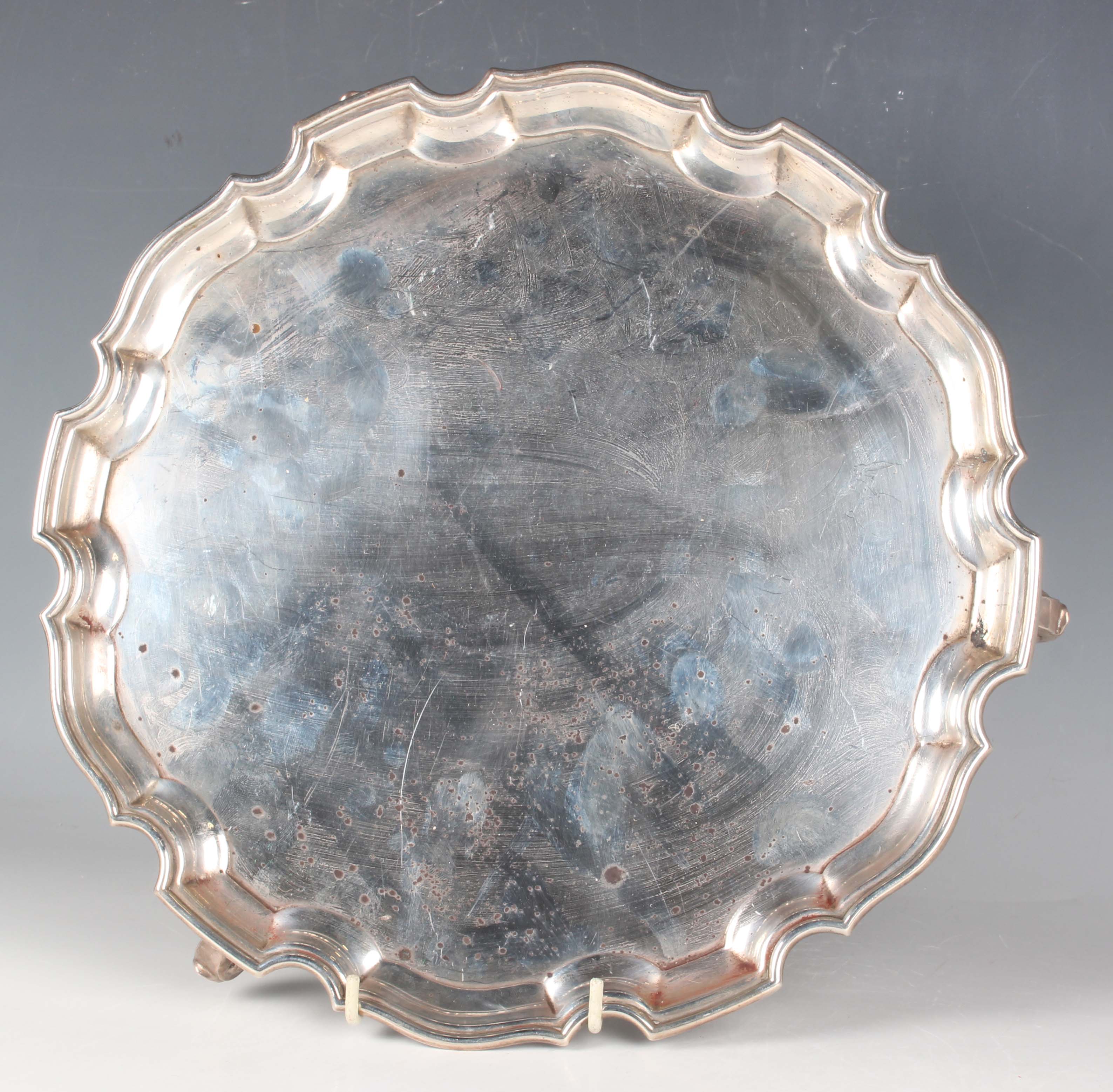 A George VI silver circular salver with piecrust rim, raised on scroll feet, Birmingham 1938 by S. Blanckensee & Son Ltd, weight 825.8g, diameter 30.8cm.