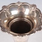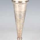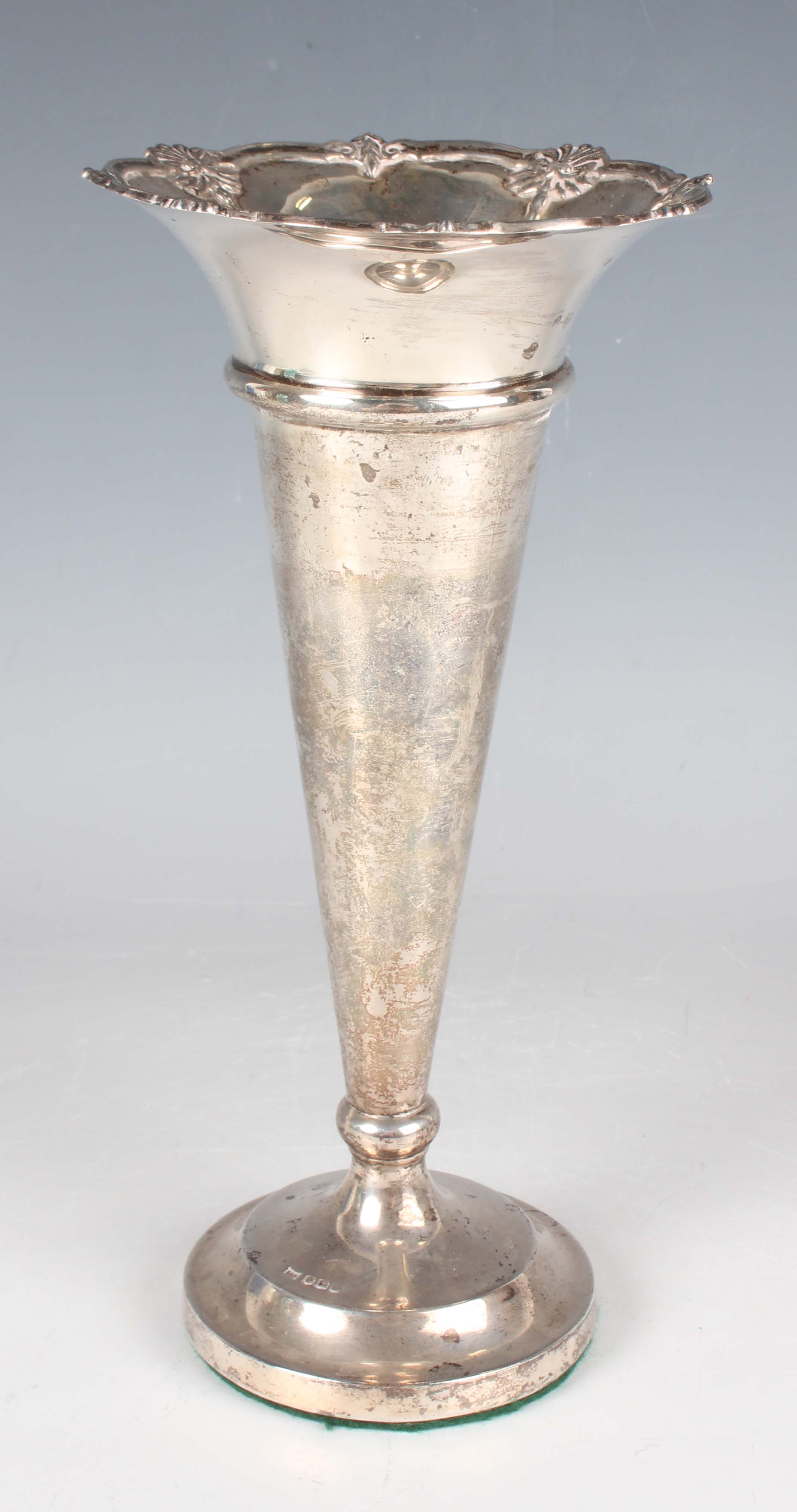 A George V silver specimen vase of tapering cylindrical form, the flared rim cast with scallop shells and leaves, on a circular weighted base, Sheffield 1931 by Walker & Hall, height 20.5cm.
